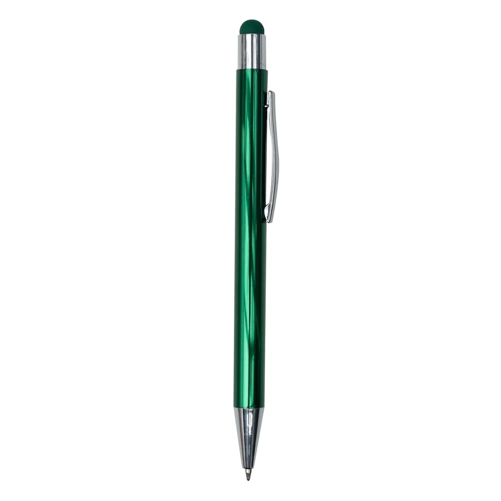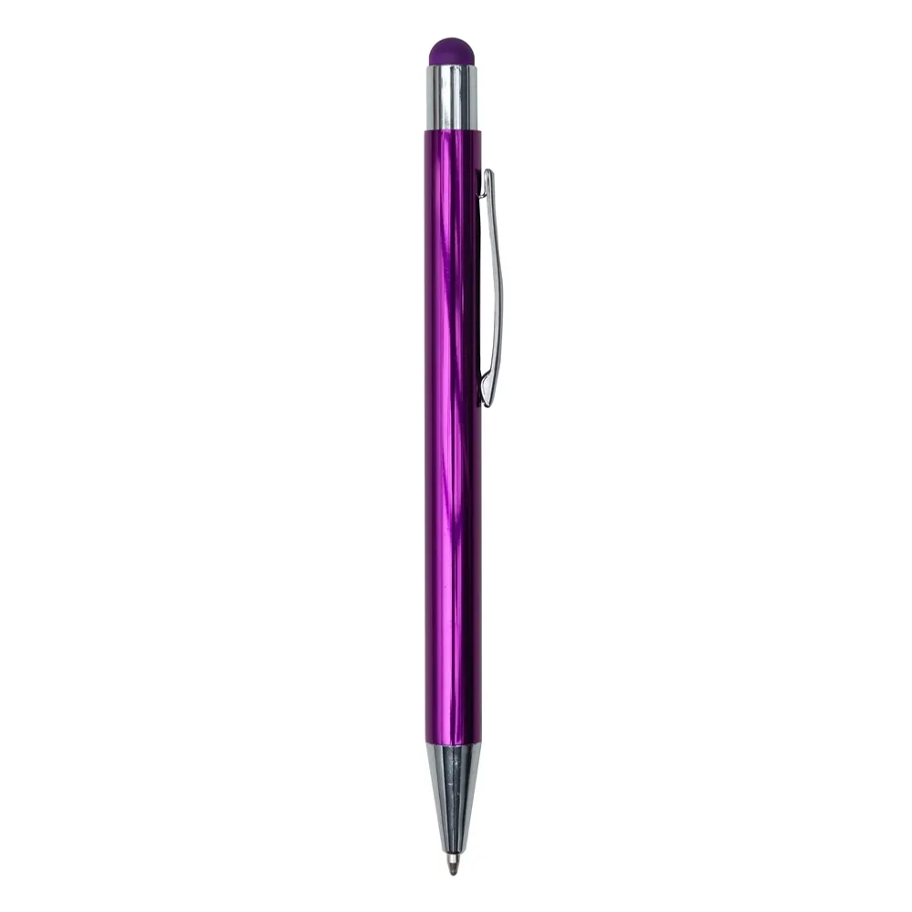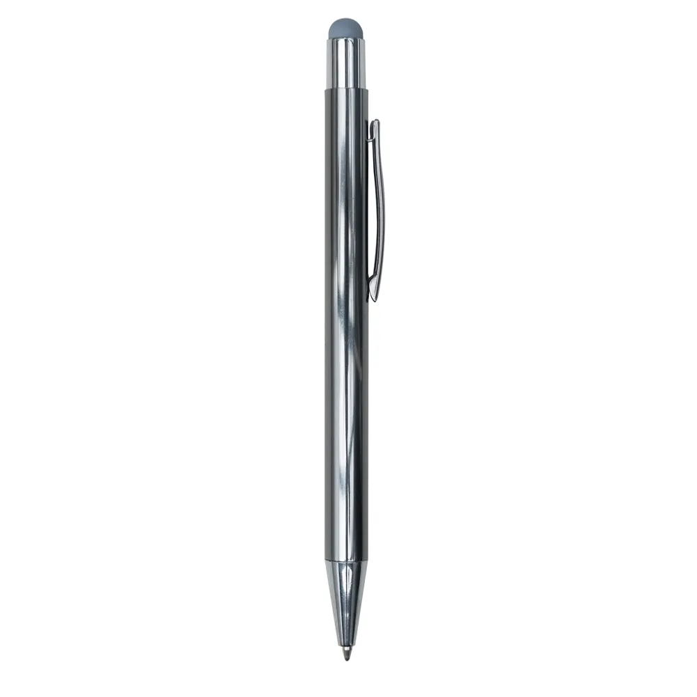 Caneta metálica com touch screen, carga esferográfica azul e acionamento por clique.