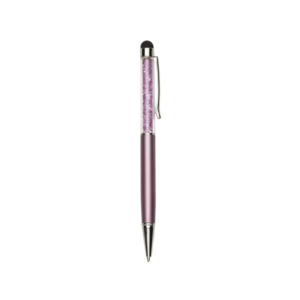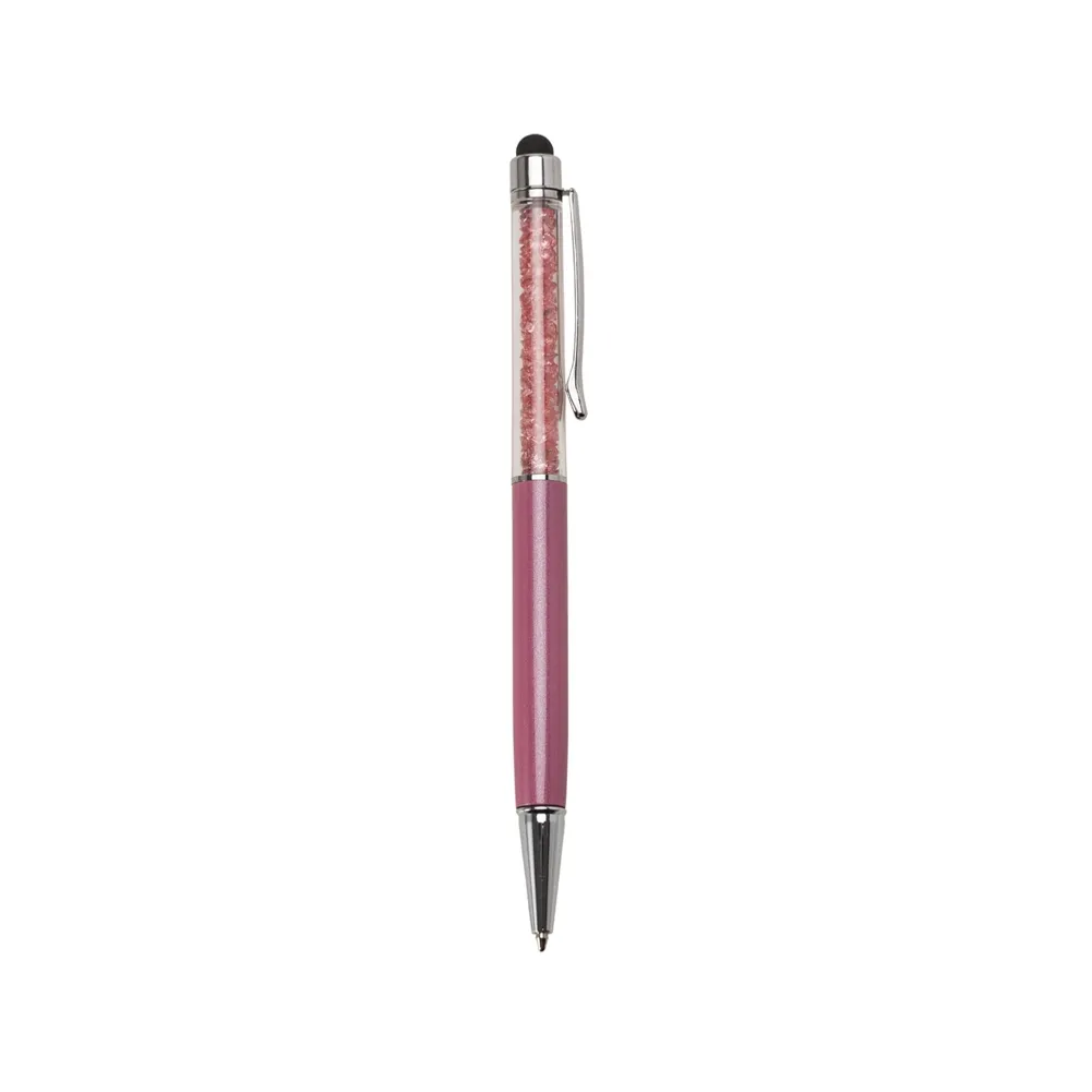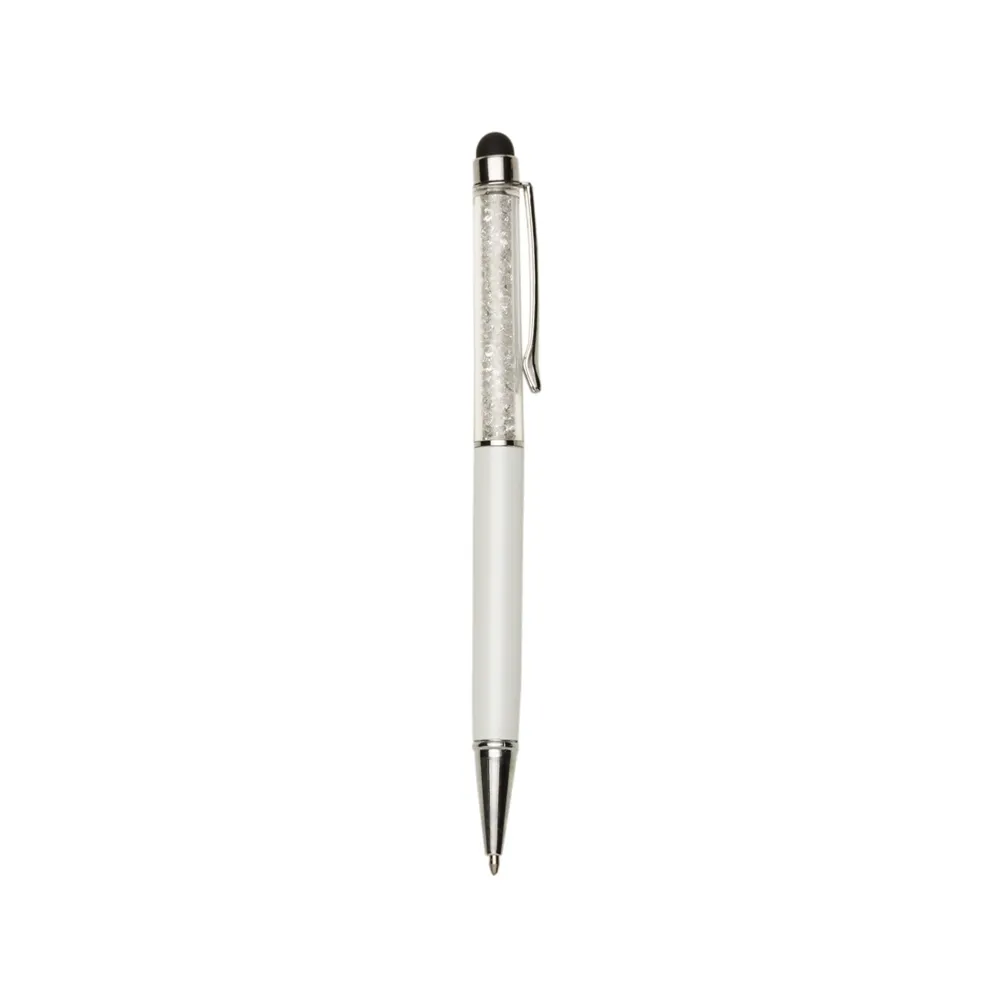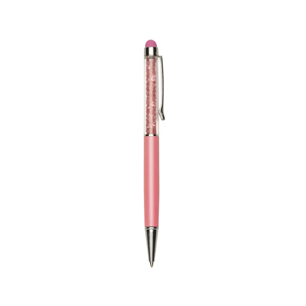 Caneta metálica com touch screen e detalhes em cristal, carga esferográfica azul e acionamento por rotação.