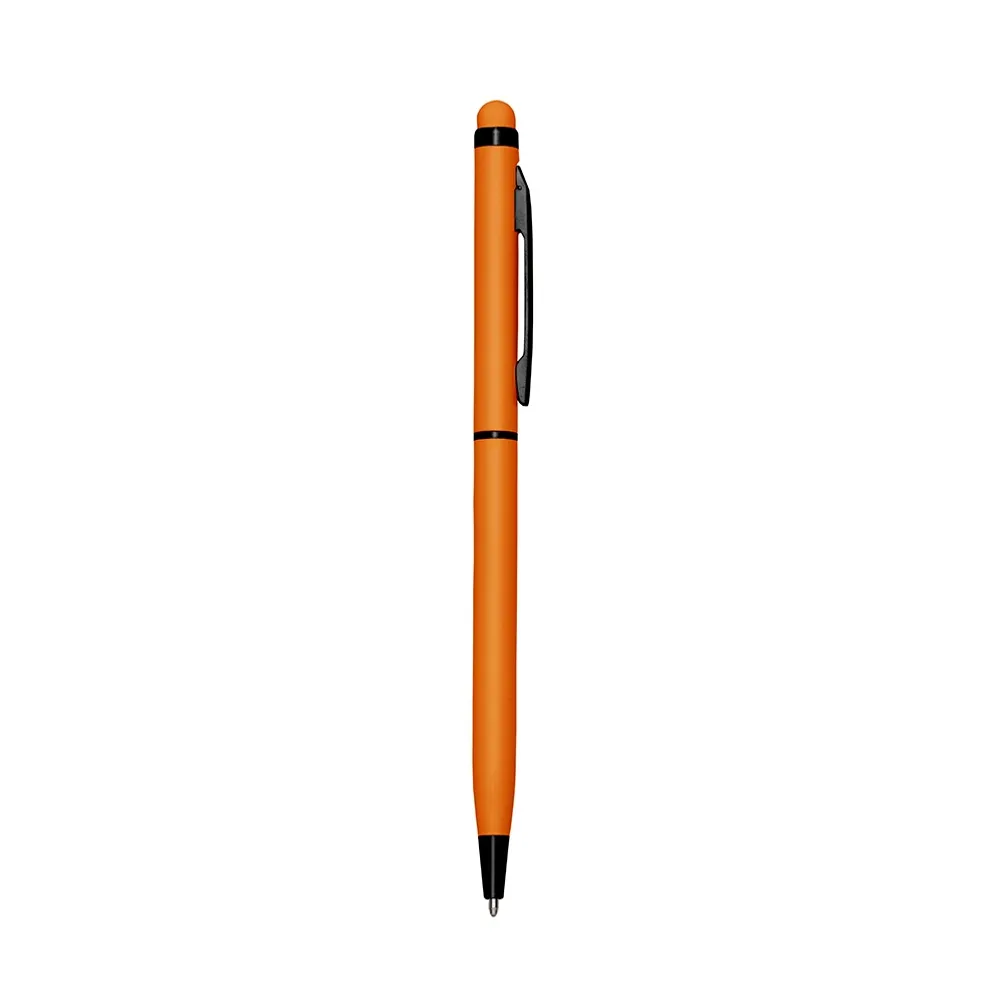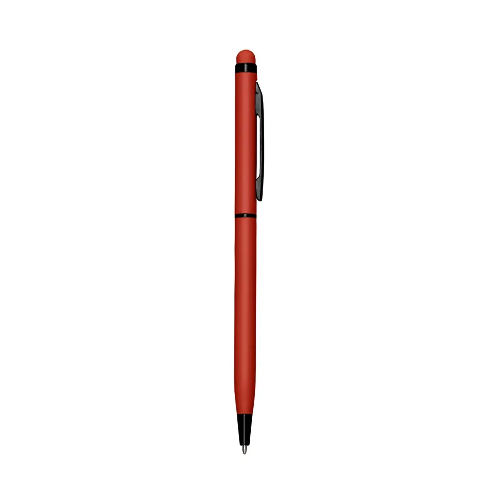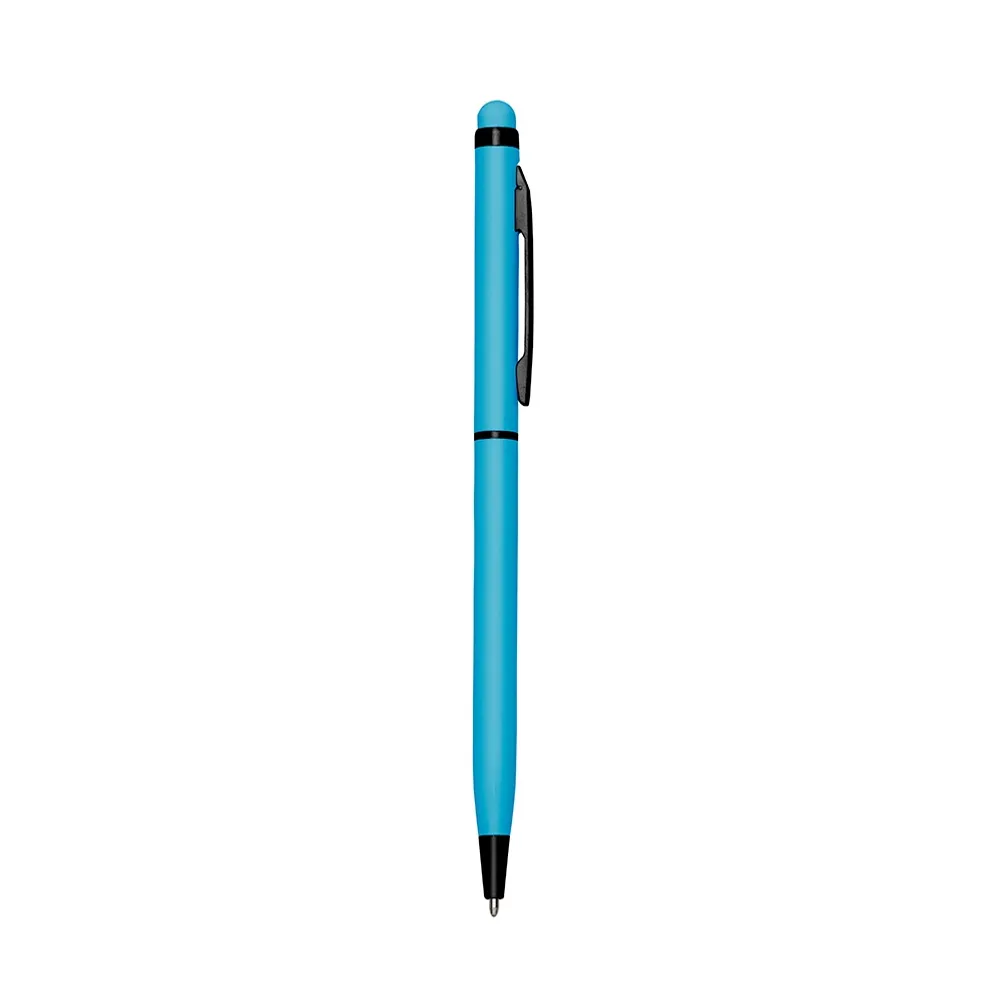 Caneta metálica com touch screen, carga esferográfica azul e acionamento por rotação.