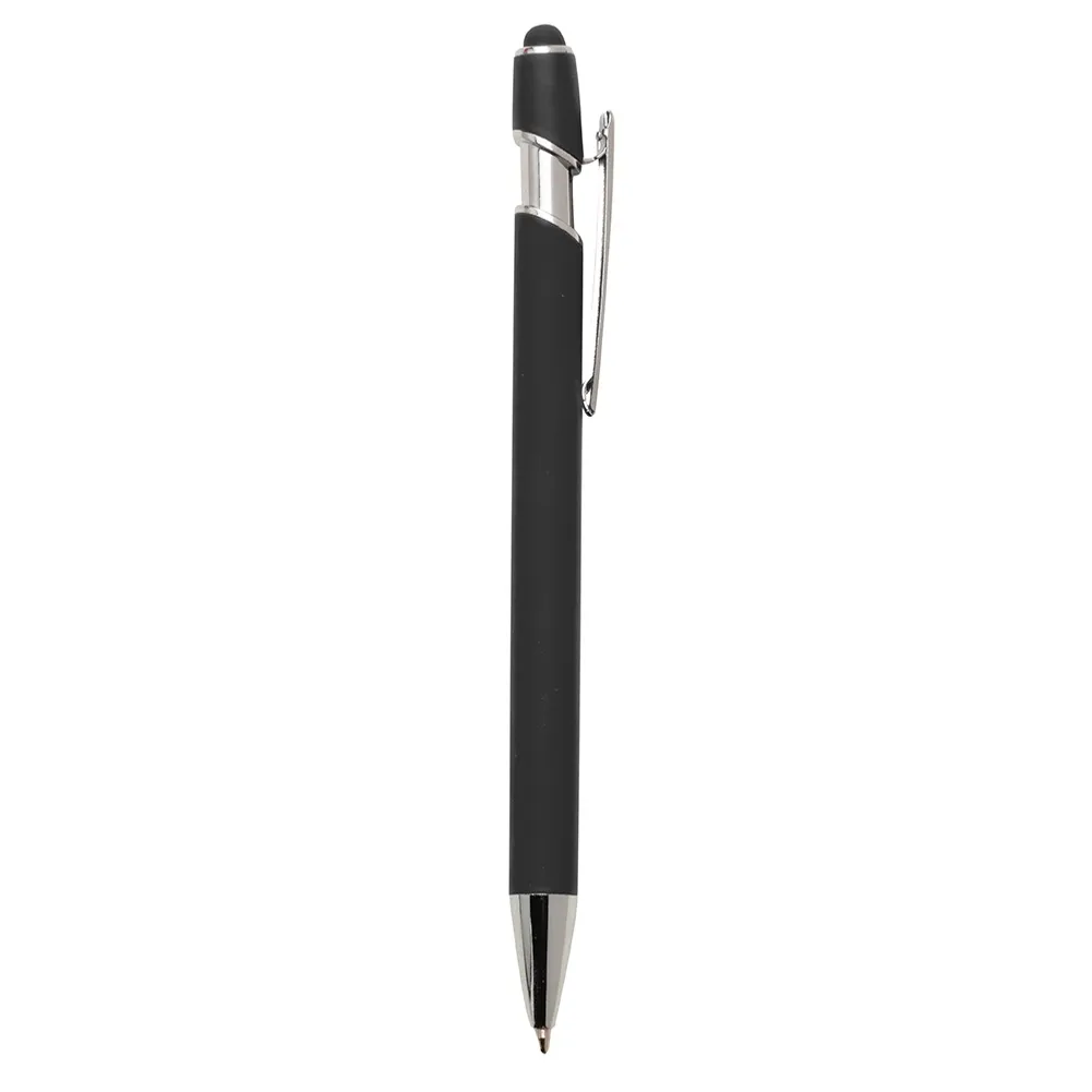 Caneta metálica com touch screen e acabamento emborrachado, carga esferográfica azul e acionamento por clique.