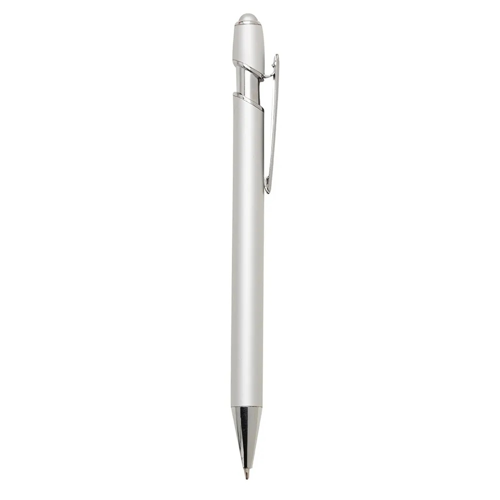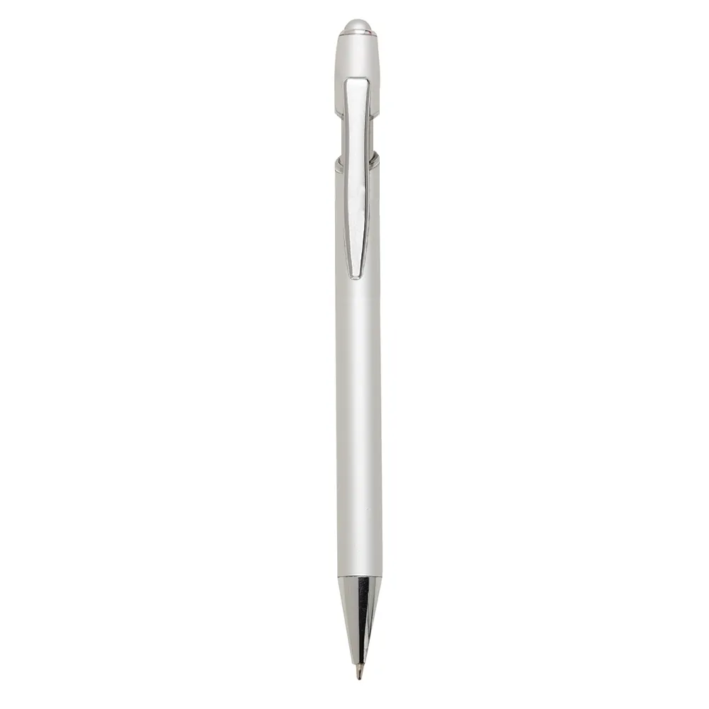 Caneta metálica com touch screen, carga esferográfica azul e acionamento por clique.