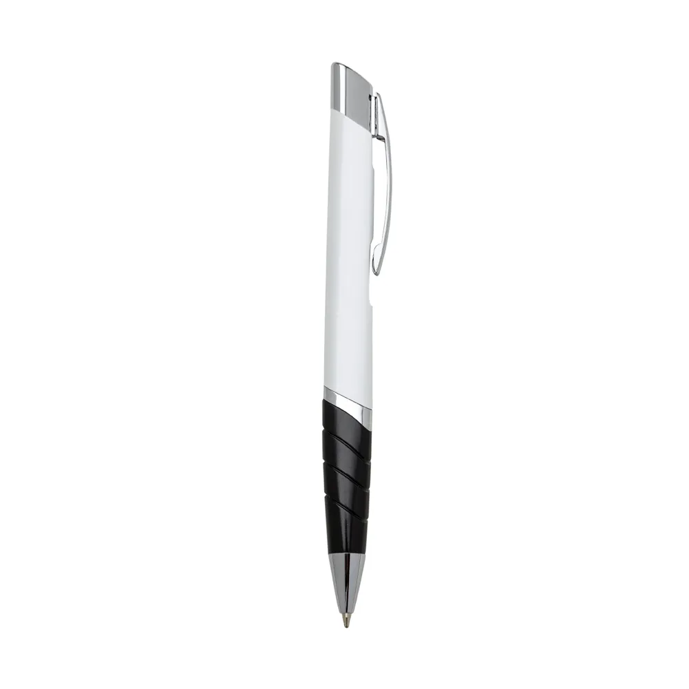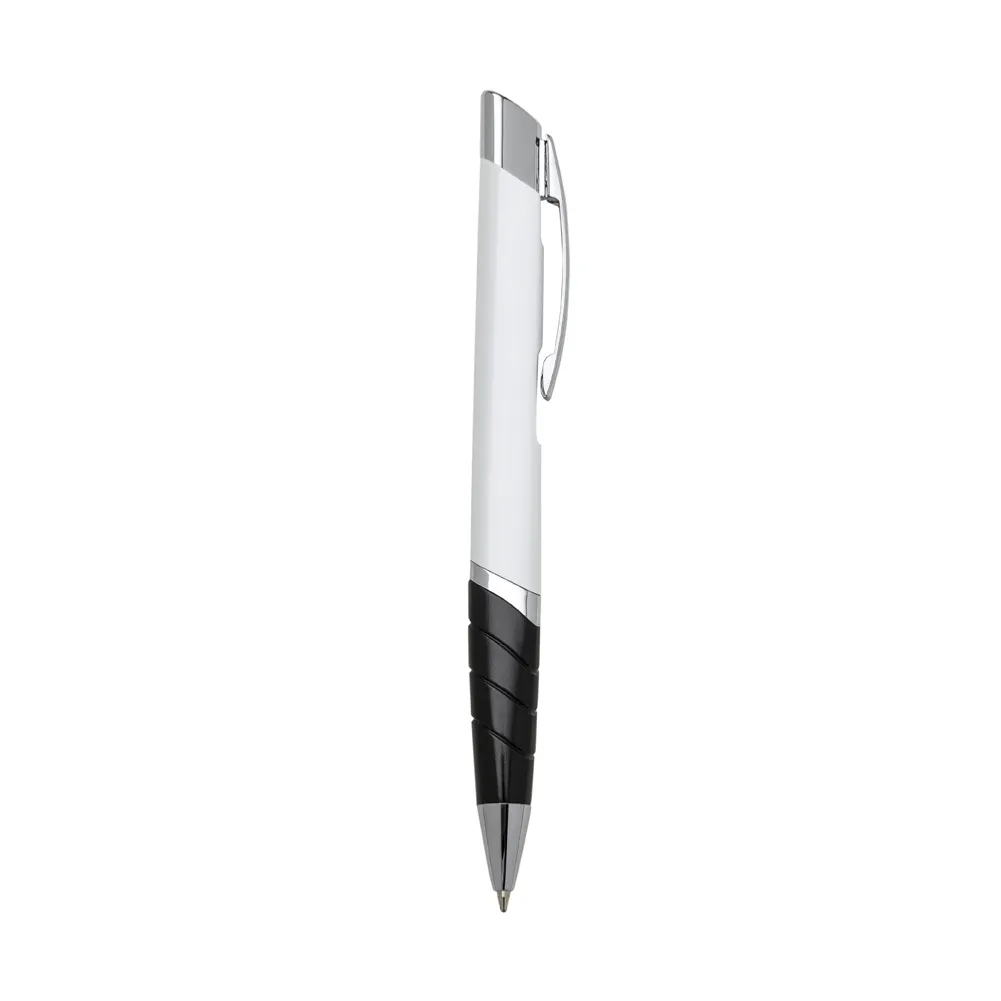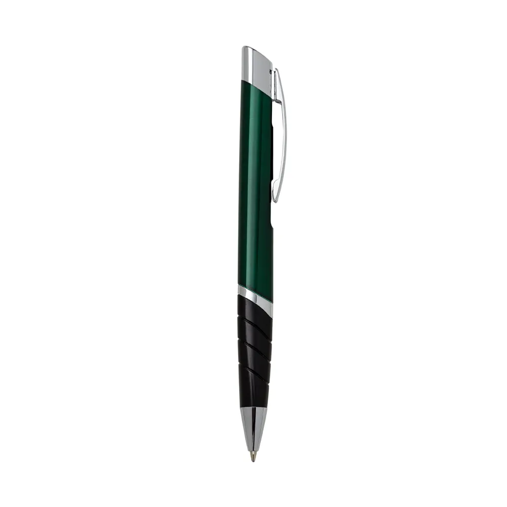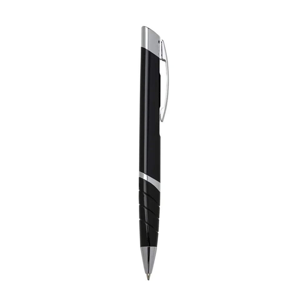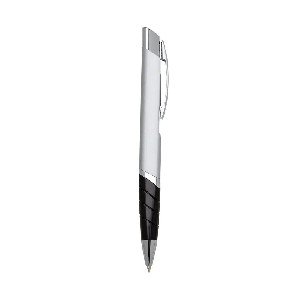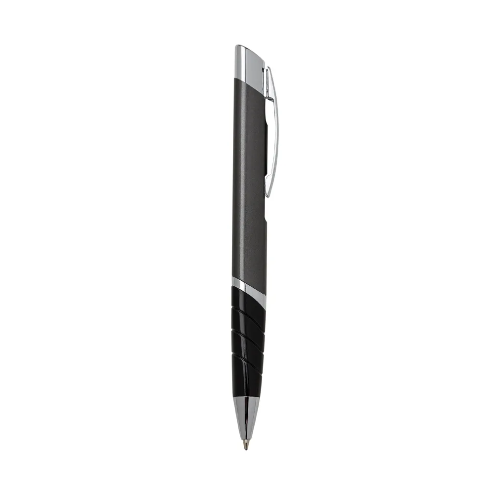 Caneta metálica triangular com carga esferográfica azul e acionamento por clique.