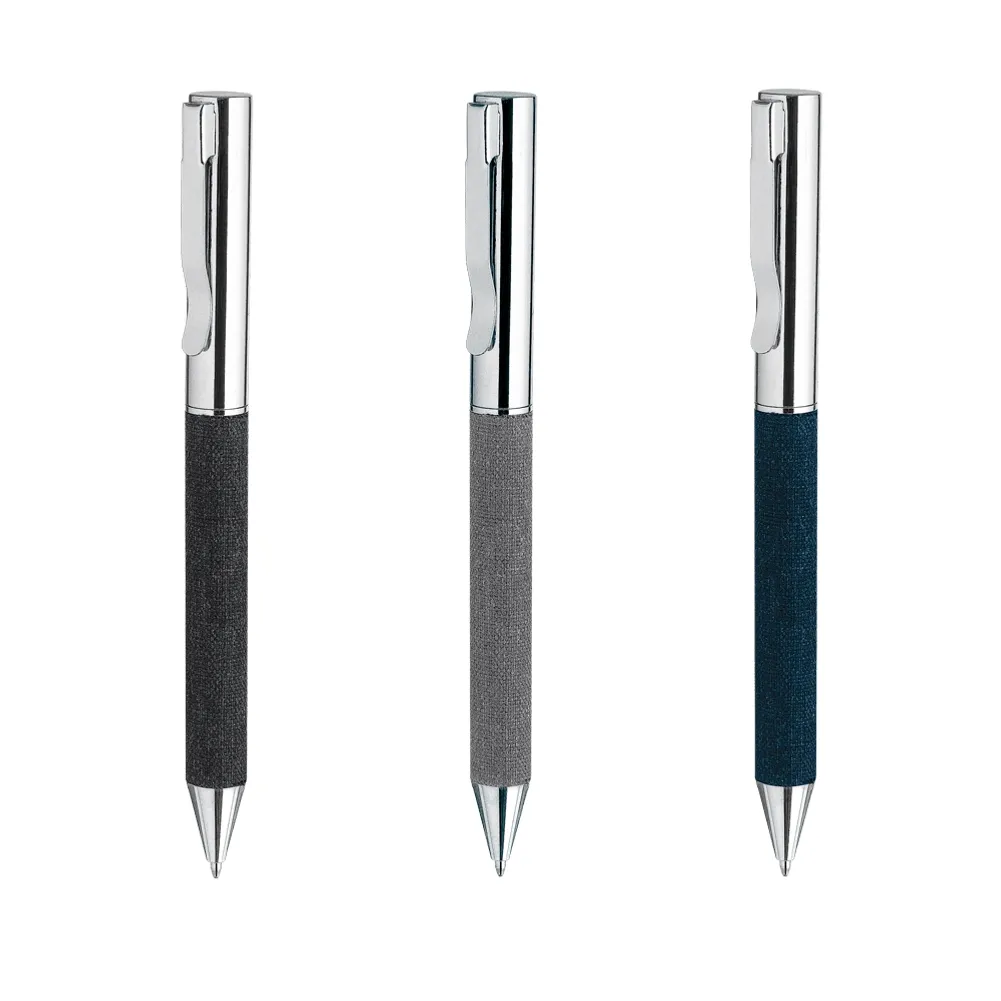 Caneta esferográfica de metal com pintura áspera em escrita preta. Acompanha estojo em material reciclável na cor da caneta.