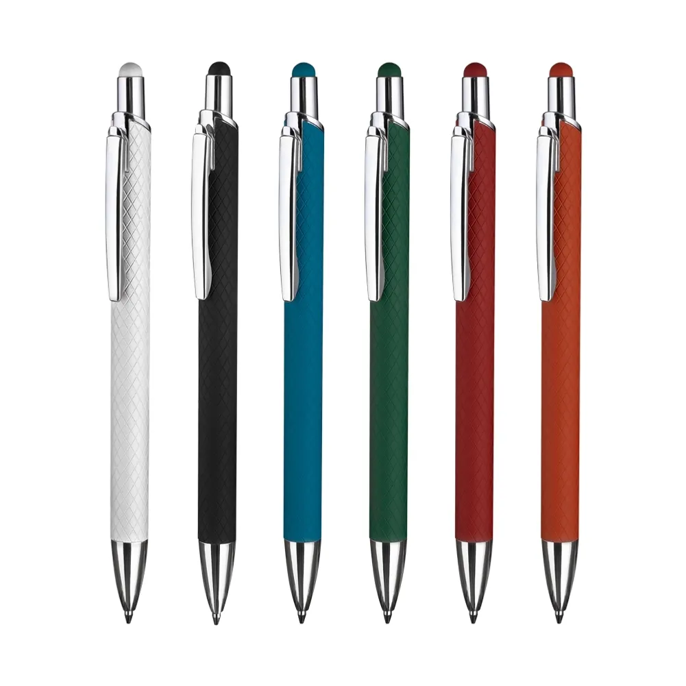 Caneta esferográfica em alumínio reciclavel com escrita em azul. Refil tipo parker e ponta touch emborrachada.