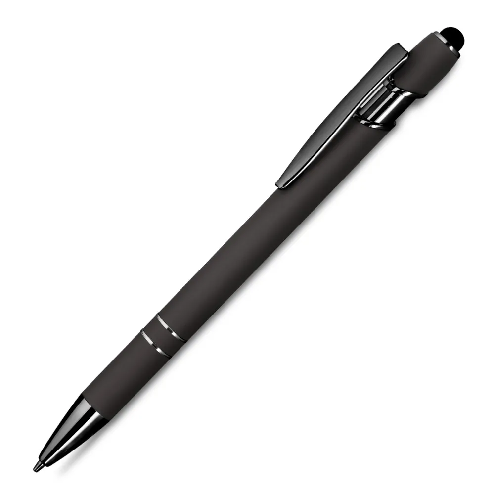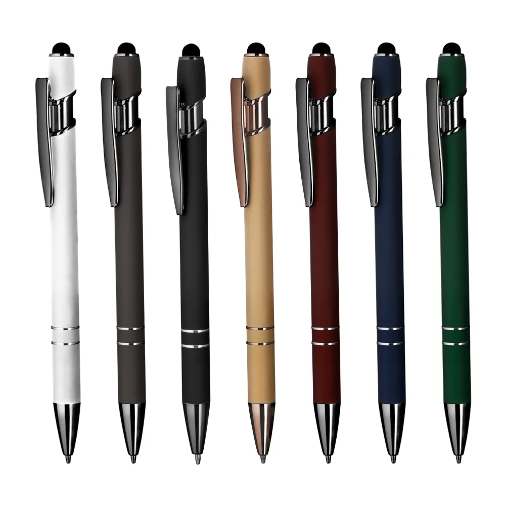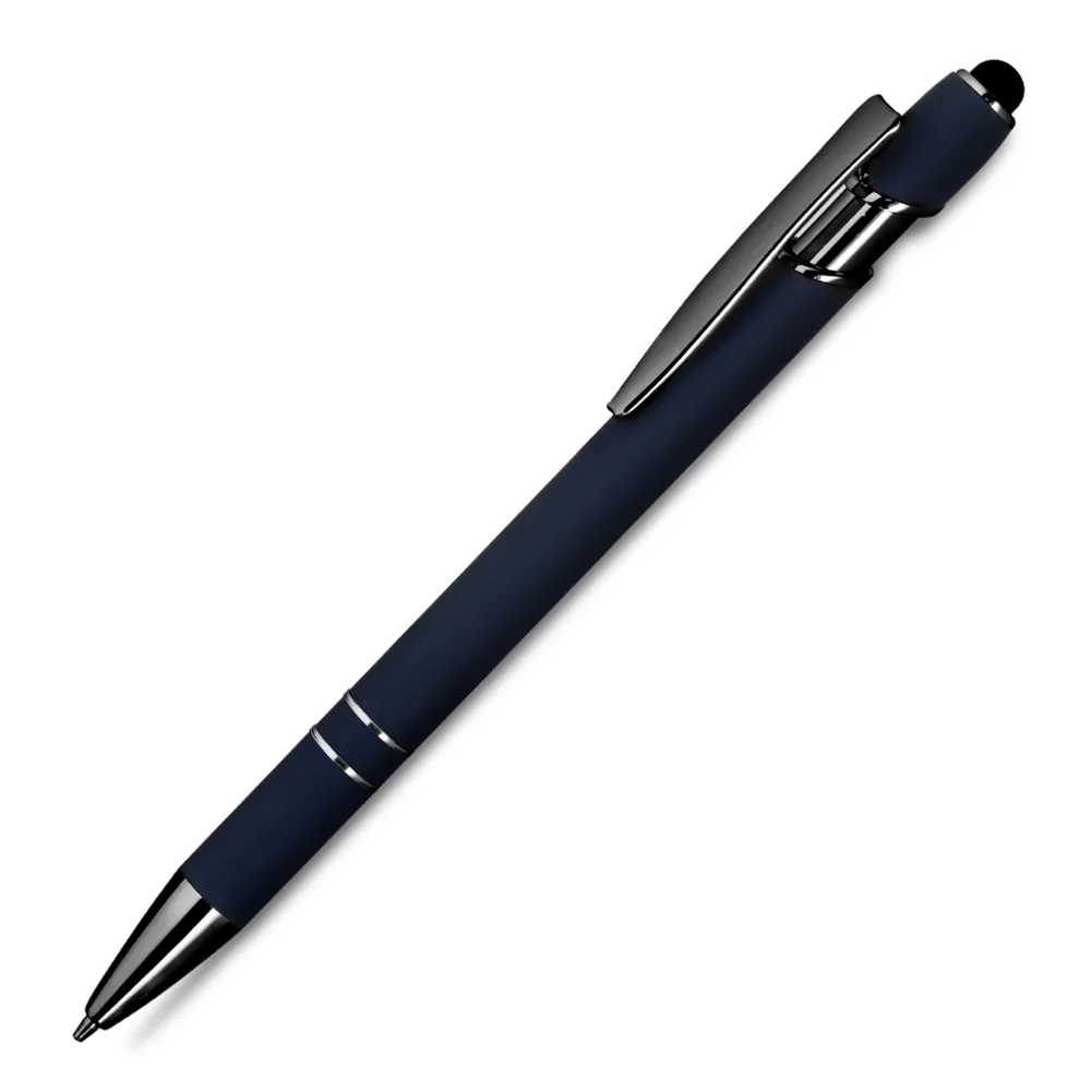 Caneta esferográfica em metal escrita em azul. Refil tipo parker com ponta touch emborrachada.