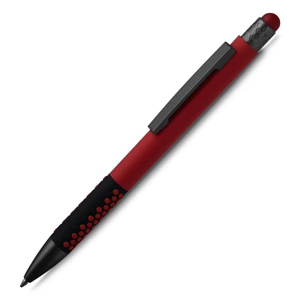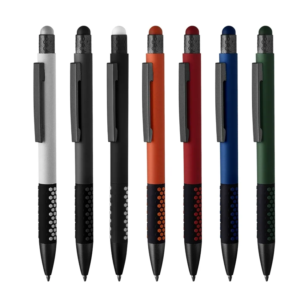 Caneta esferográfica em metal escrita em azul. Refil tipo parker, ponta touch emborrachada.