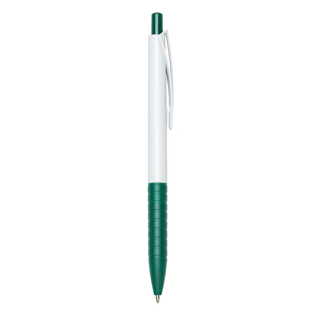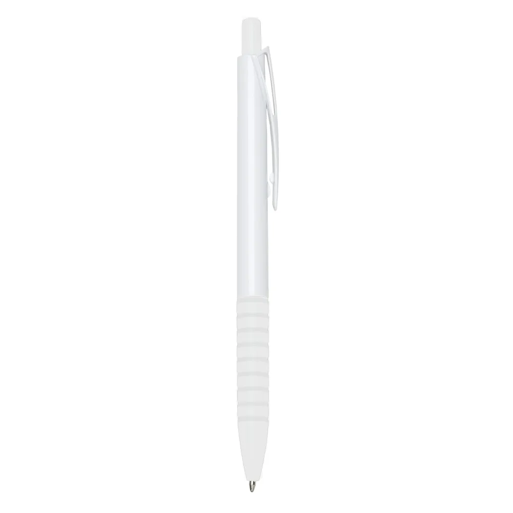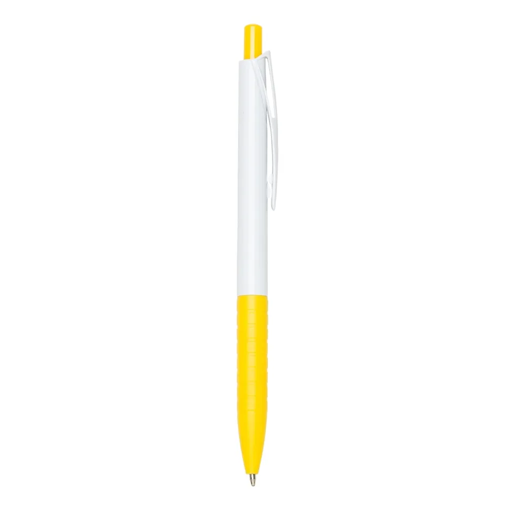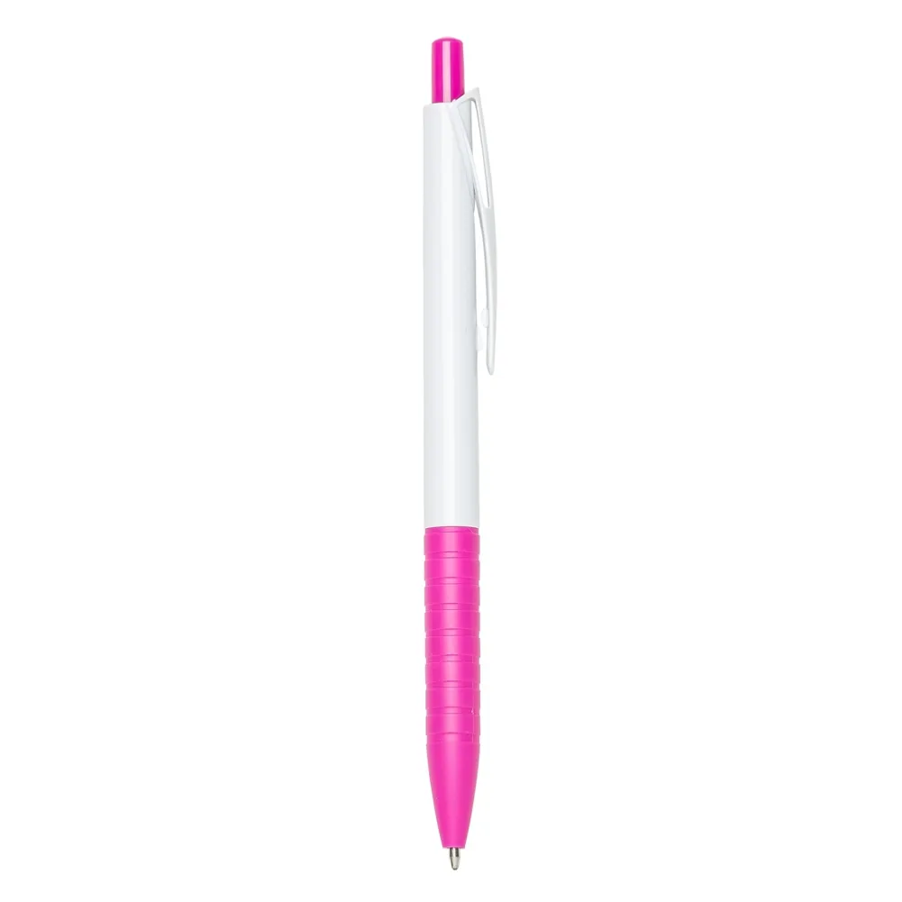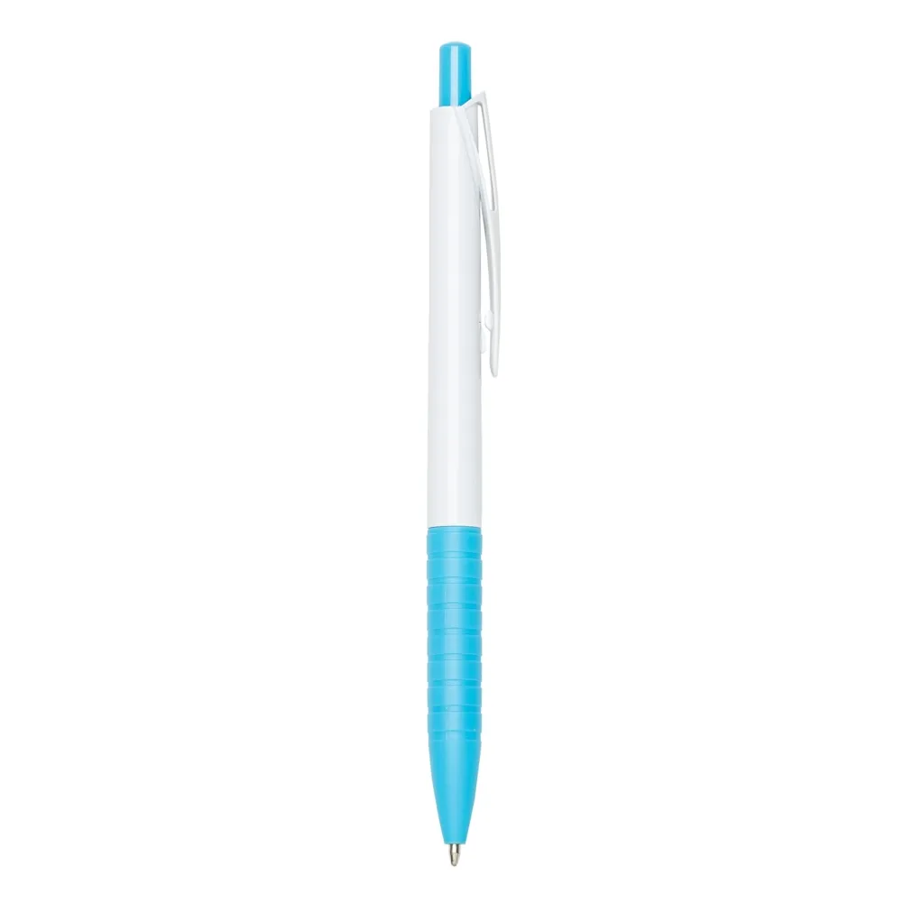 Caneta plástica com carga esferográfica azul e acionamento por clique.