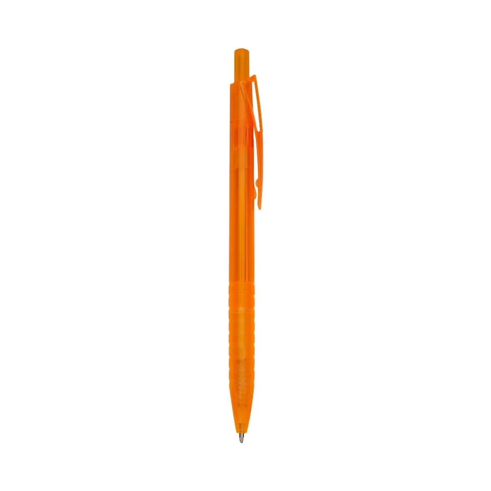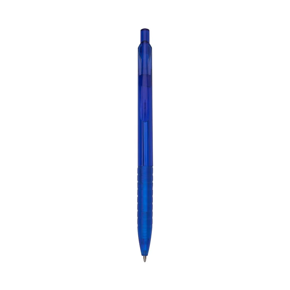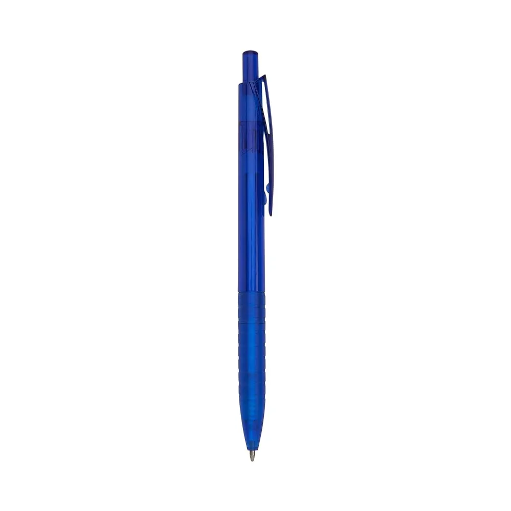 Caneta plástica translúcida com carga esferográfica azul e acionamento por clique.