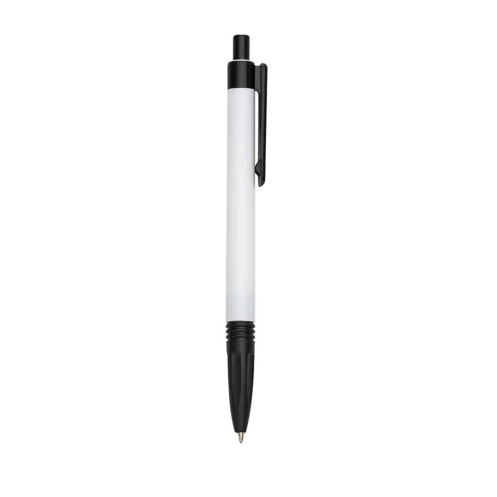 Caneta plástica com carga esferográfica azul e acionamento por clique.