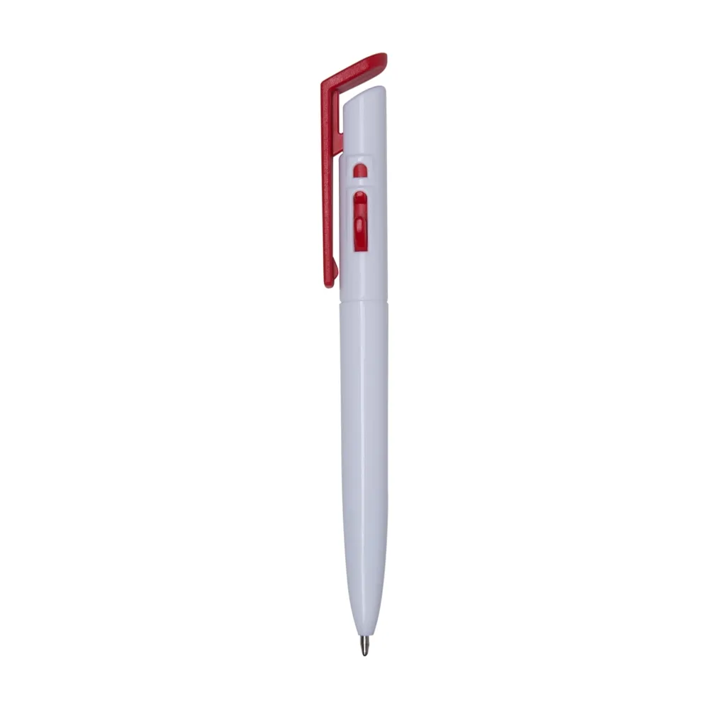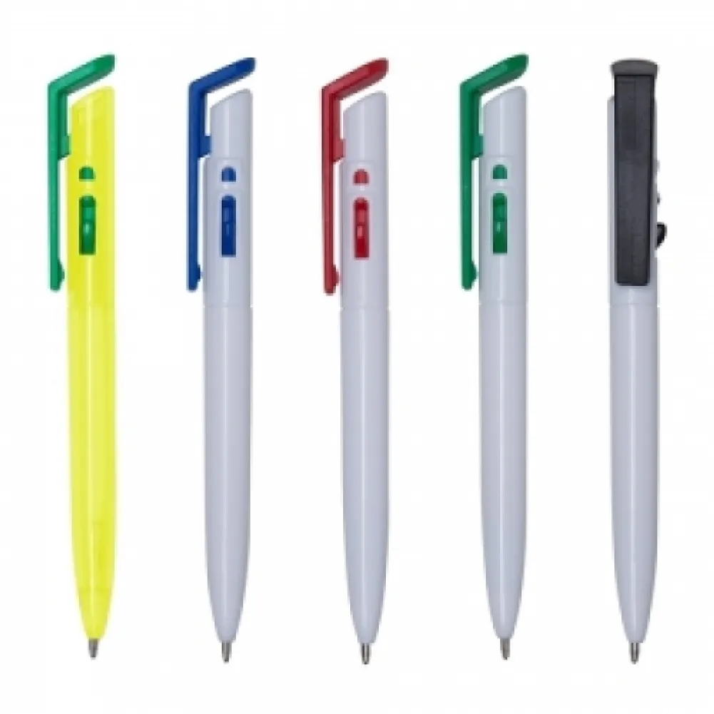 Caneta plástica com carga esferográfica azul e acionamento por clique.