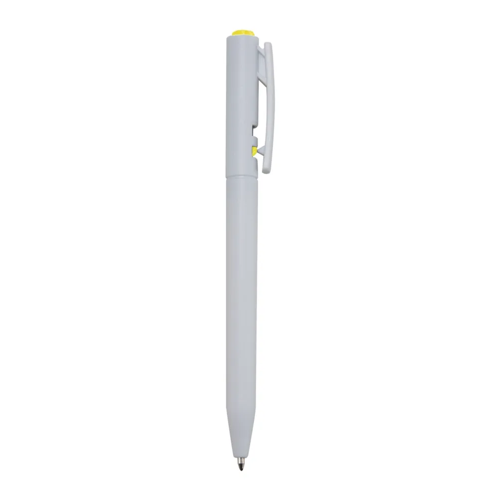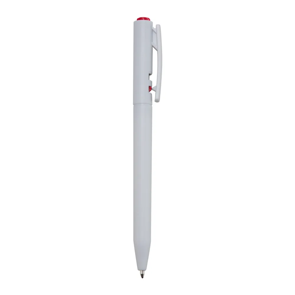 Caneta plástica com carga esferográfica azul e acionamento por clique.