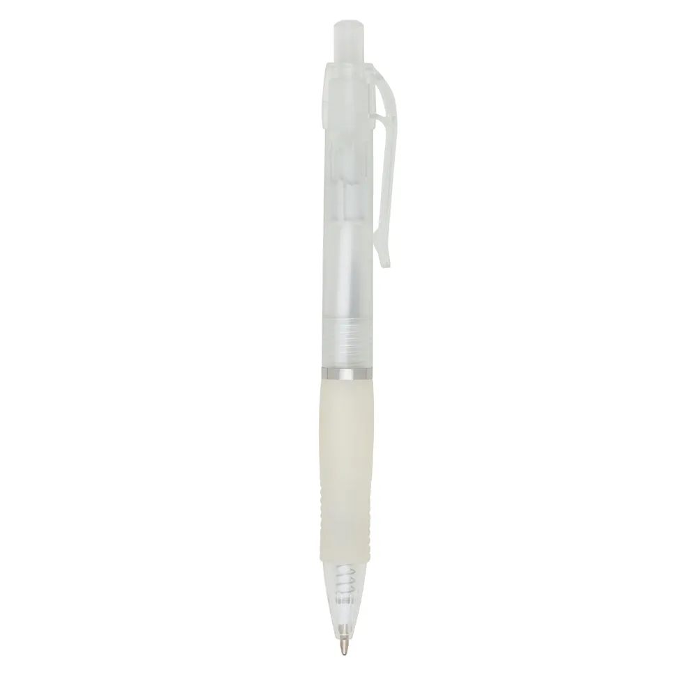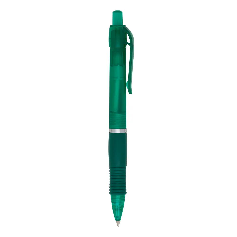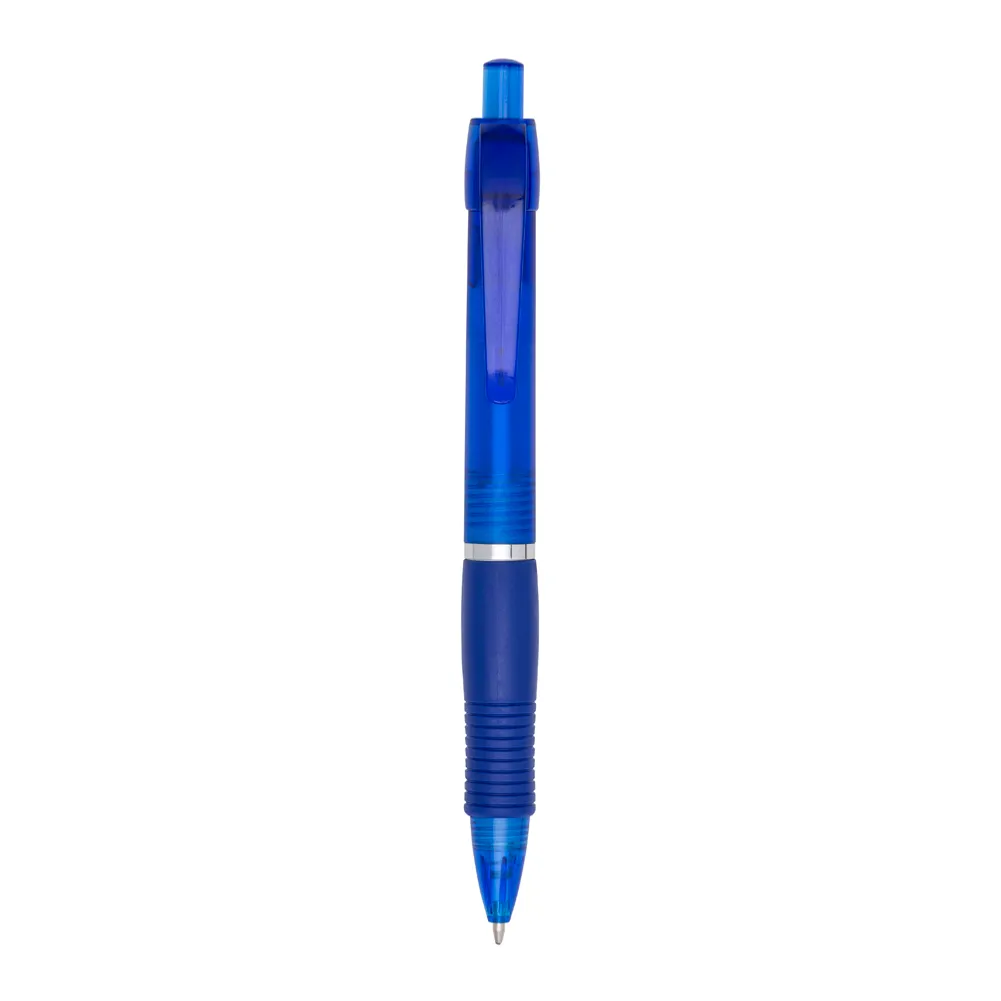 Caneta plástica com detalhe emborrachado, carga esferográfica azul e acionamento por clique.