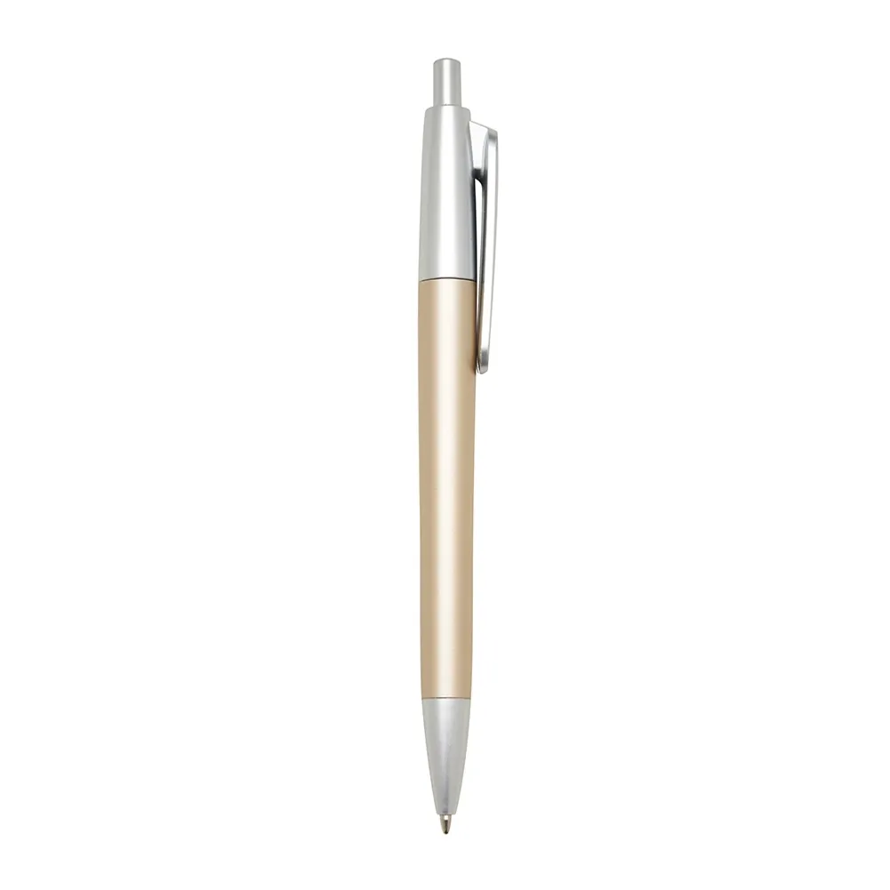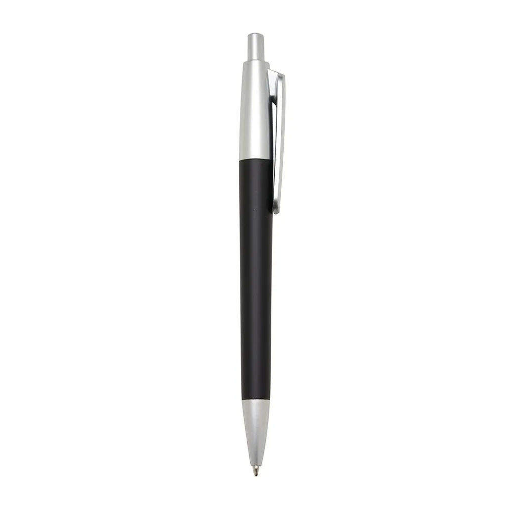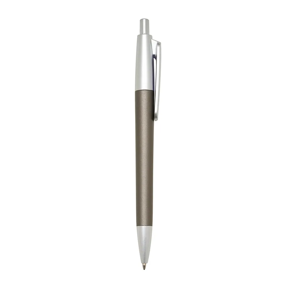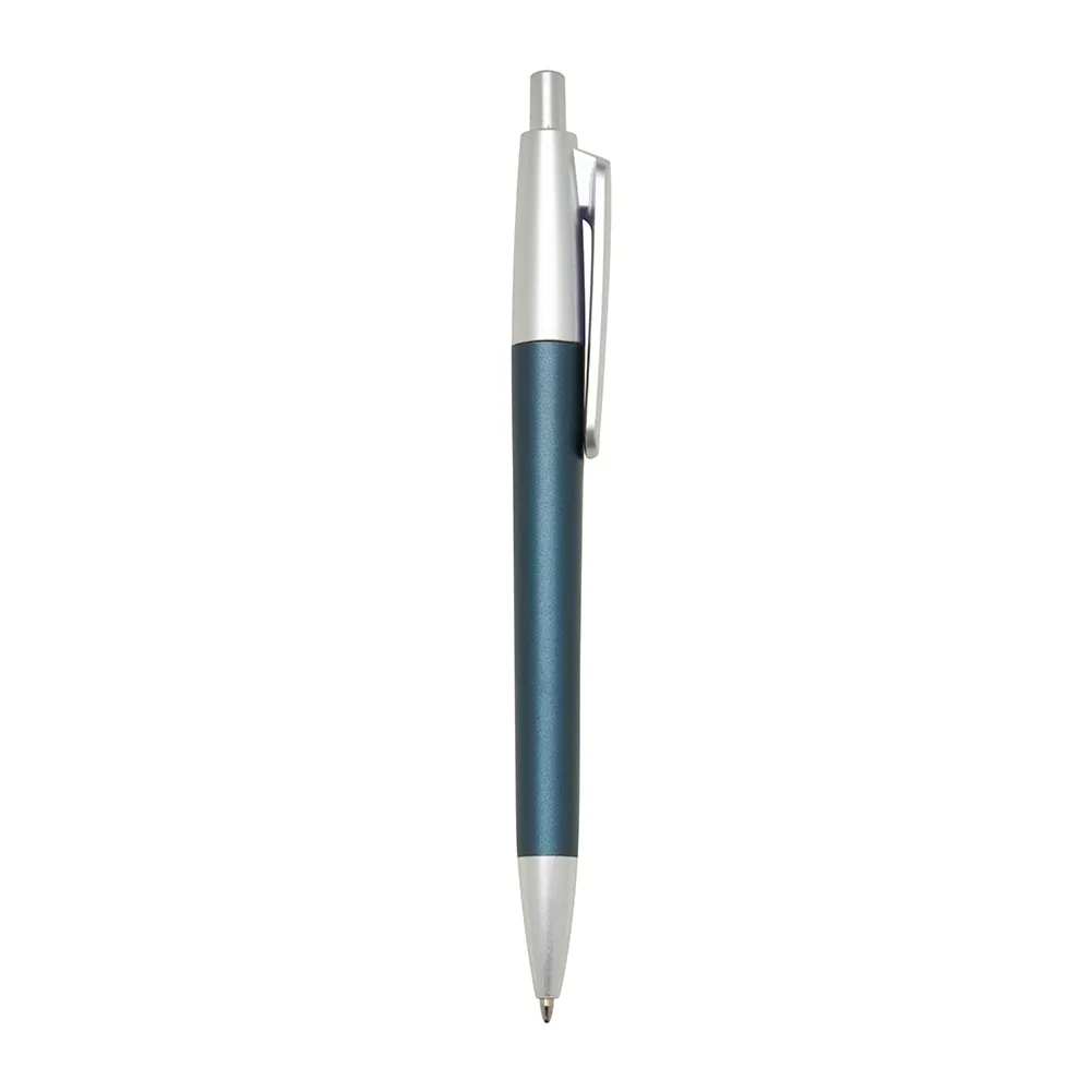 Caneta plástica com acabamento fosco e detalhes em prata, acionamento por clique e carga esferográfica azul.