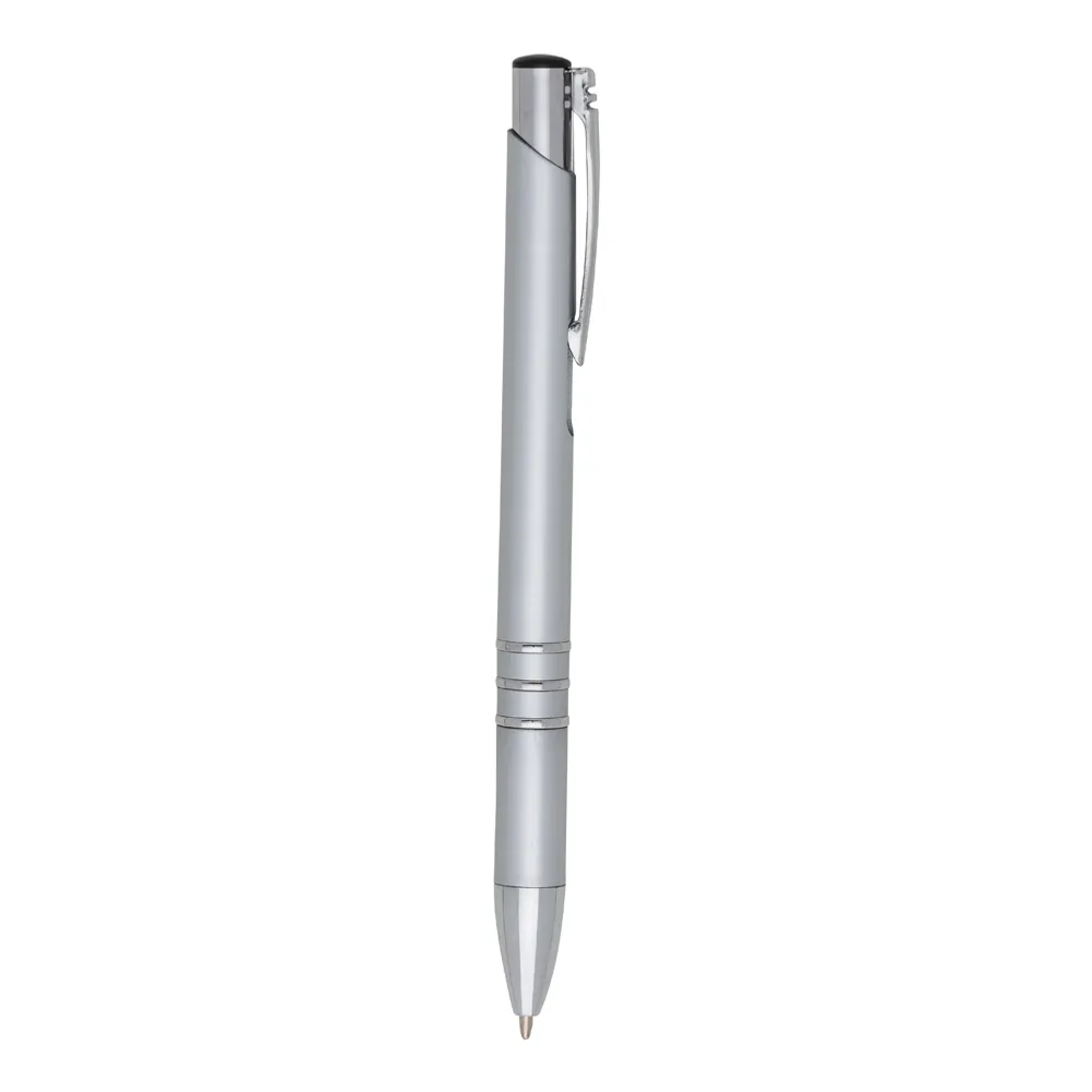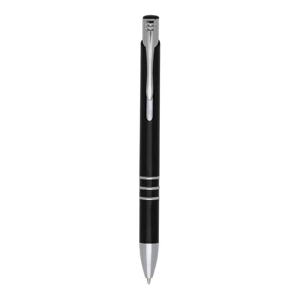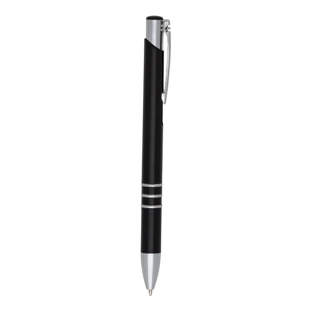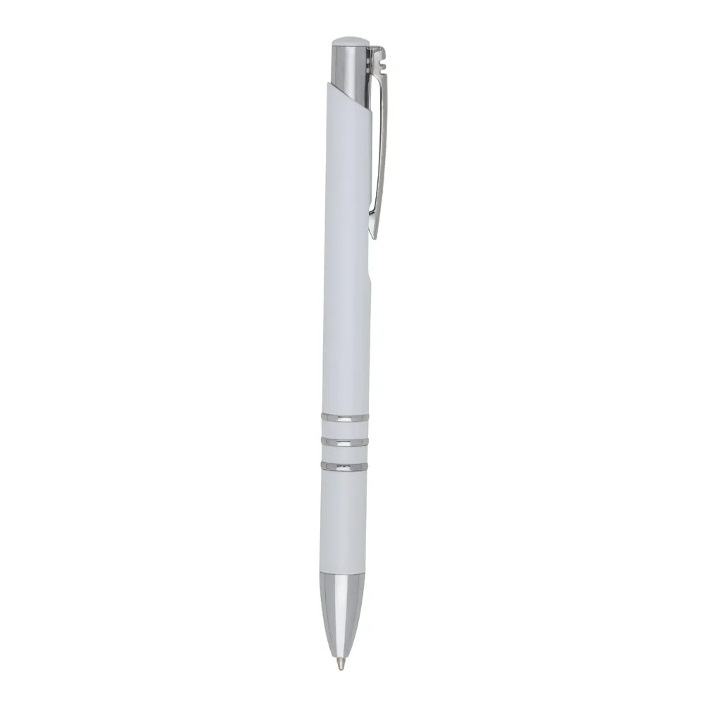Caneta plástica com carga esferográfica azul e acionamento por clique.