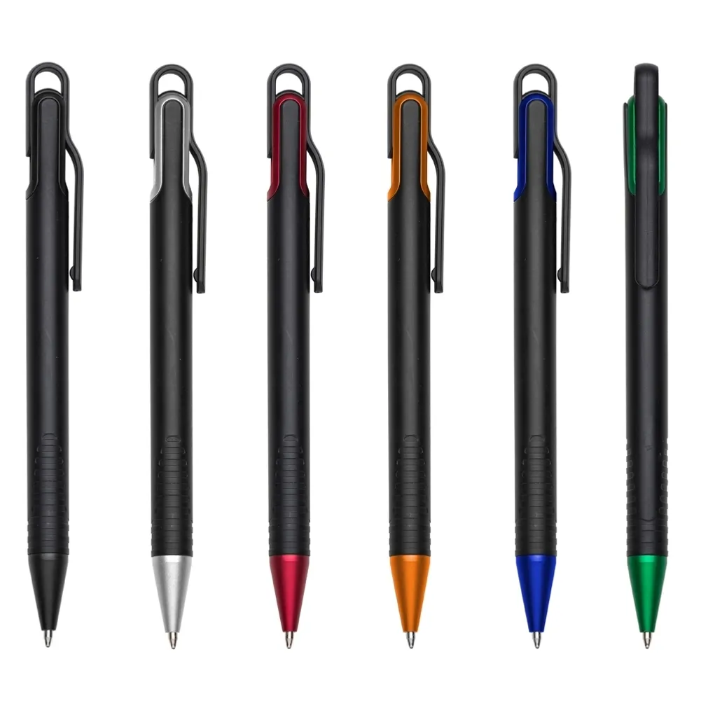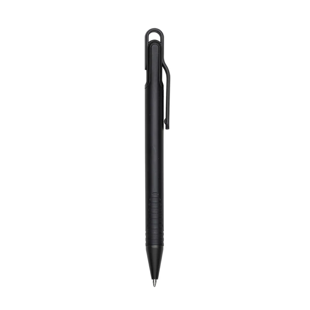 Caneta plástica com carga esferográfica azul e acionamento por clique.
