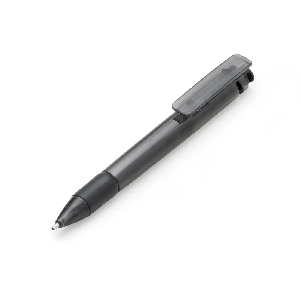 Caneta plástica com carga esferográfica azul e acionamento por clique.