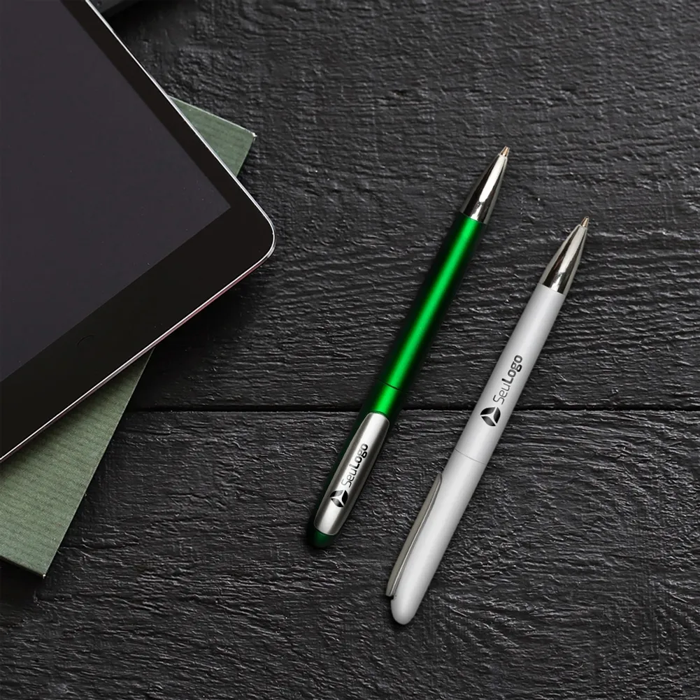 Caneta plástica com carga esferográfica azul e acionamento por clique no clipe.