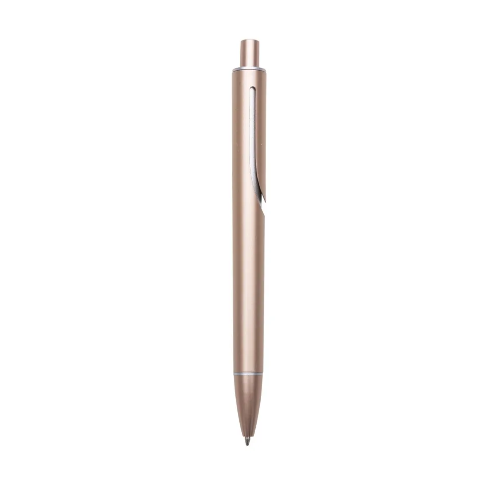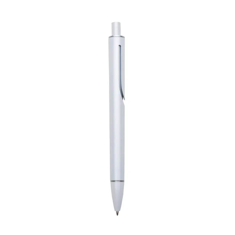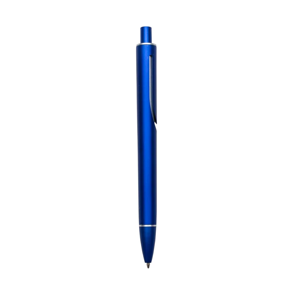 Caneta plástica com carga esferográfica azul e acionamento por clique.