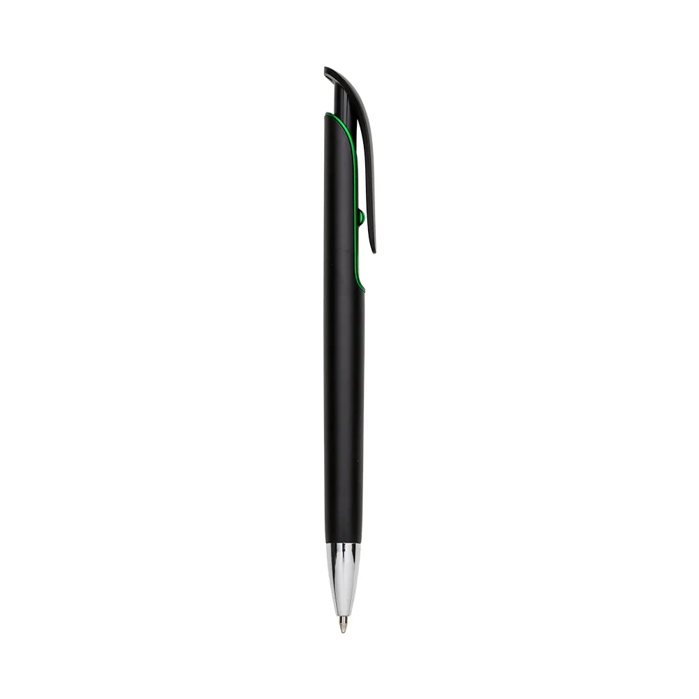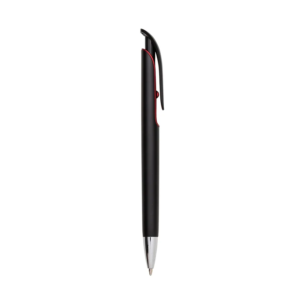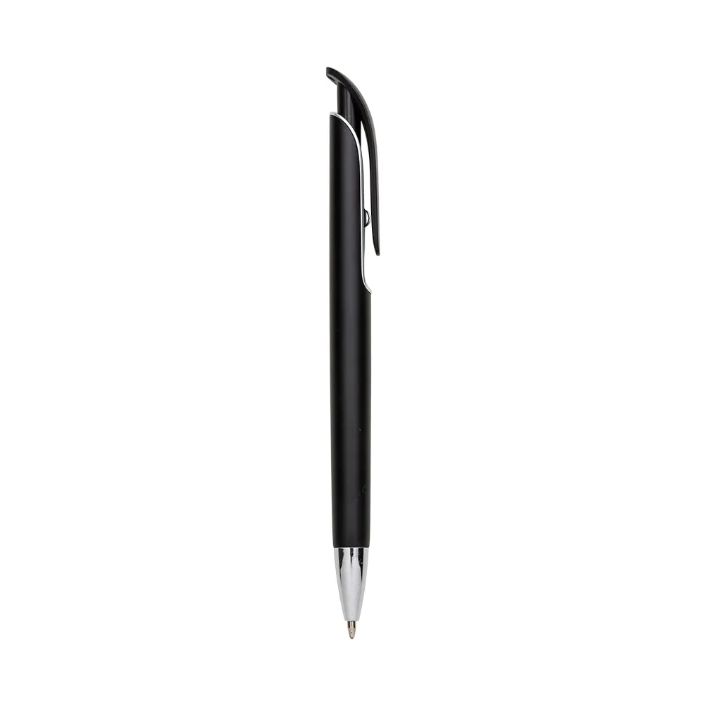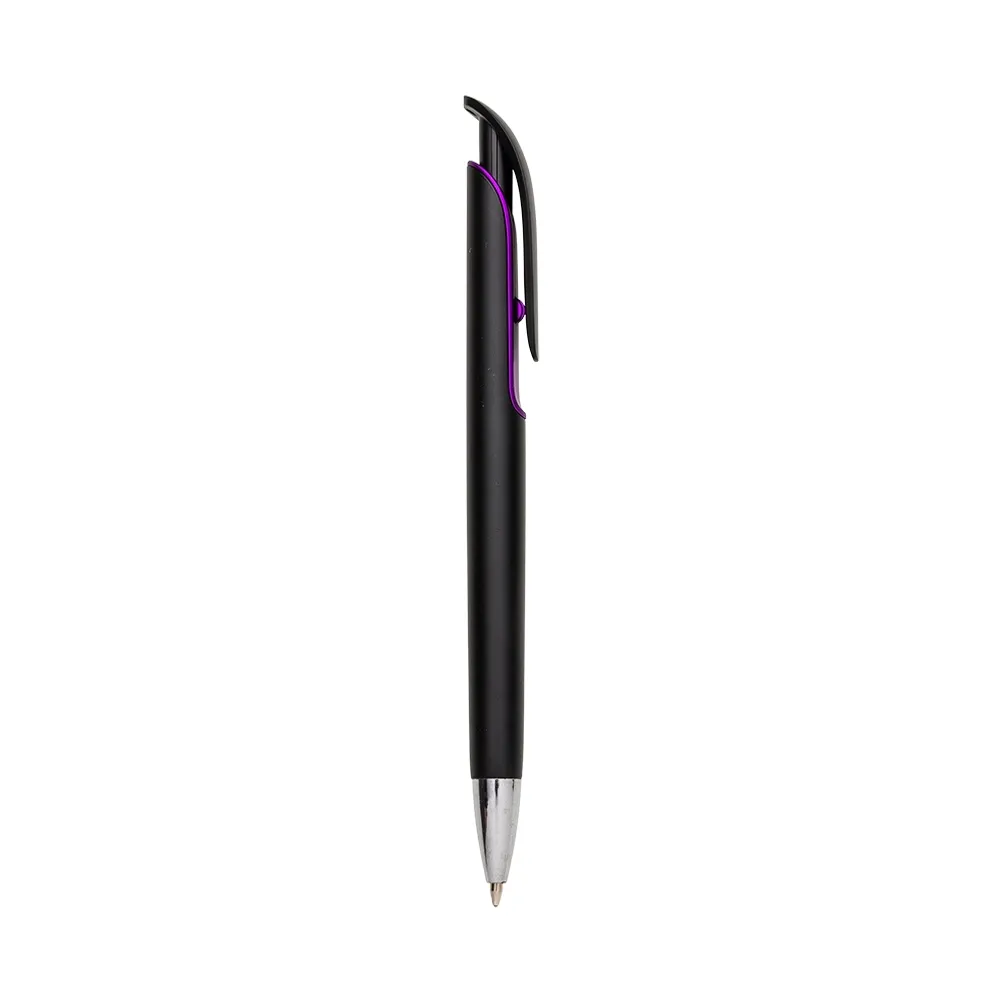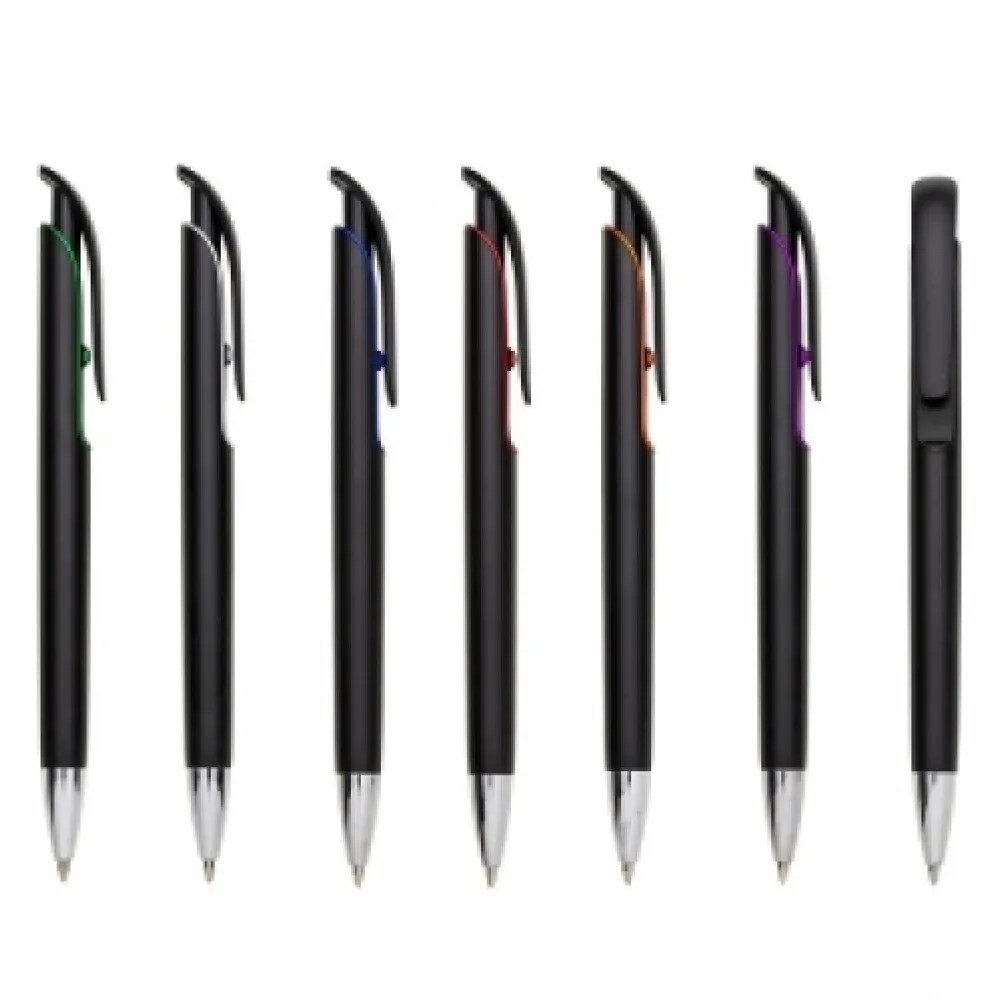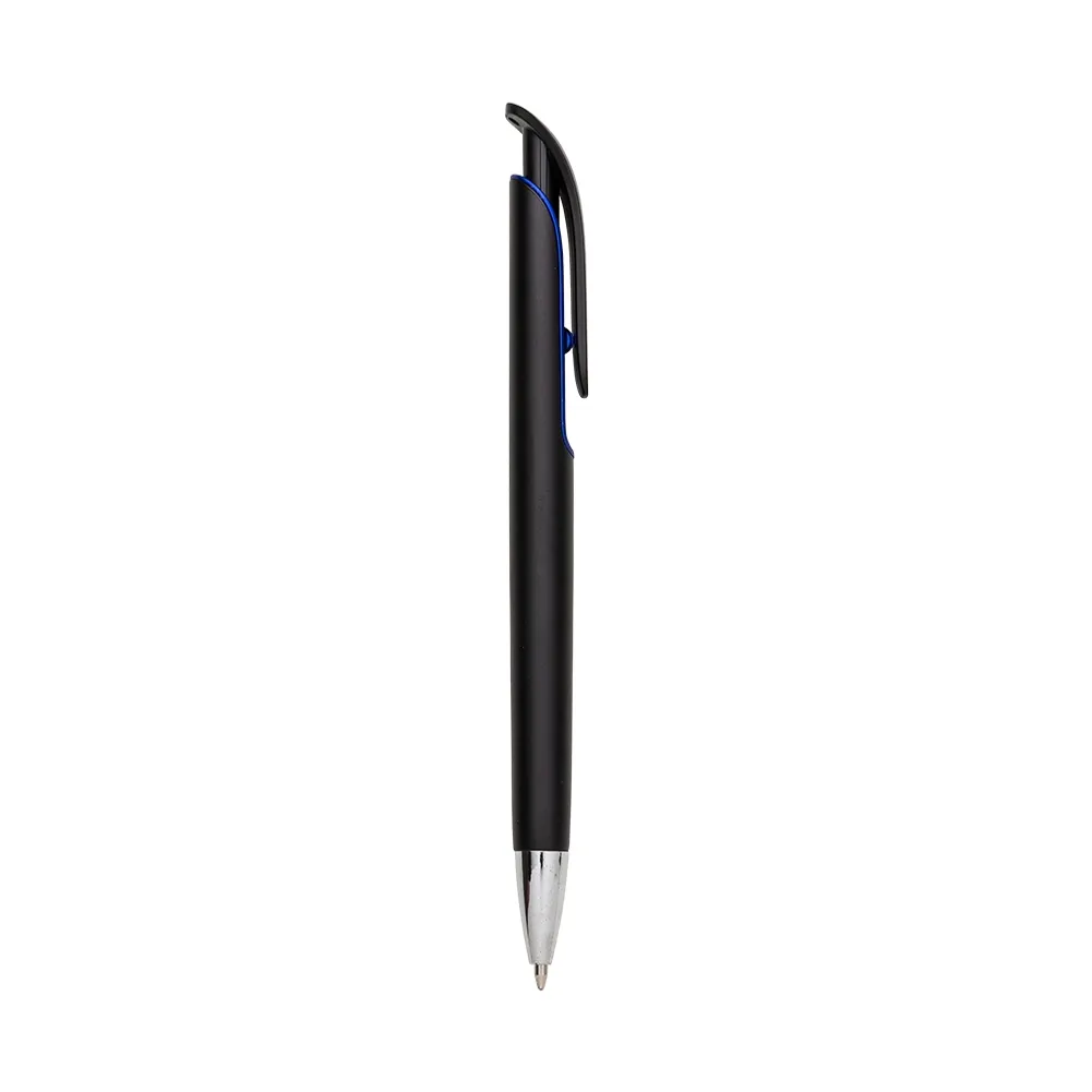 Caneta plástica com carga esferográfica azul e acionamento por clique.
