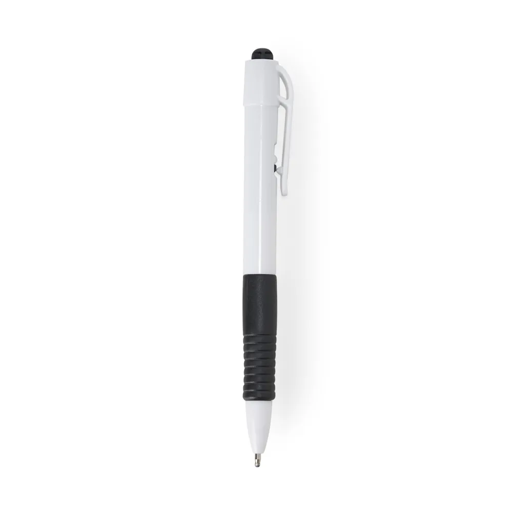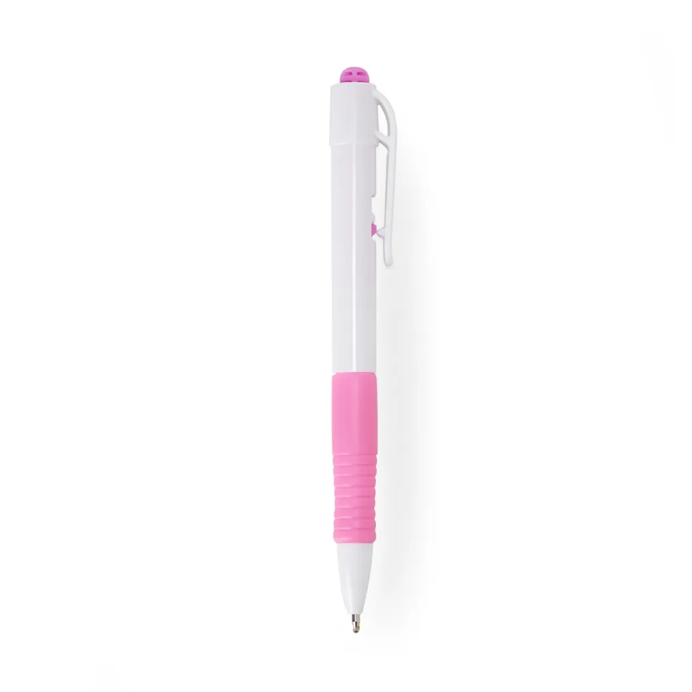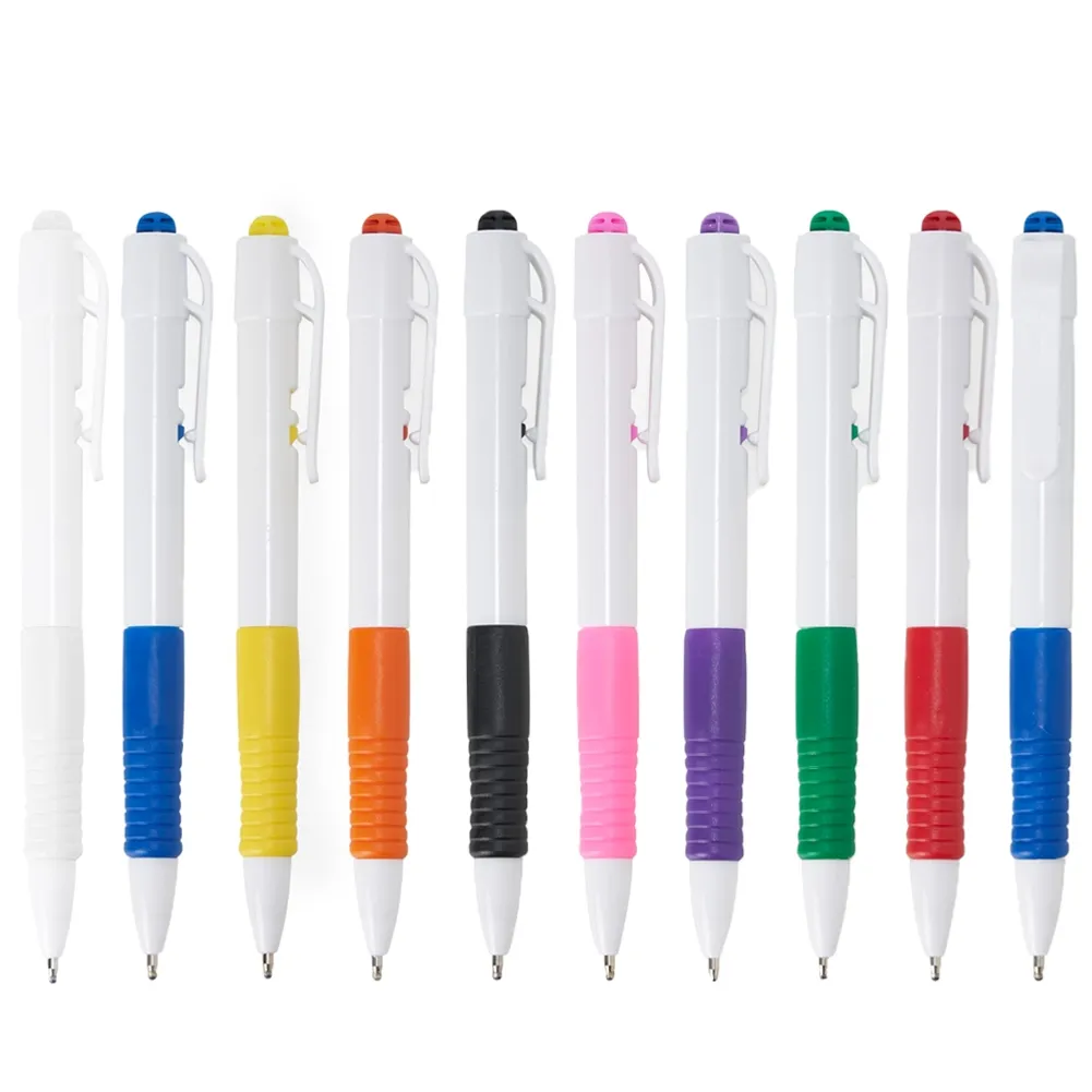 Caneta plástica com detalhe emborrachado, carga esferográfica azul e acionamento por clique.