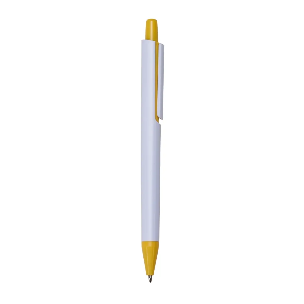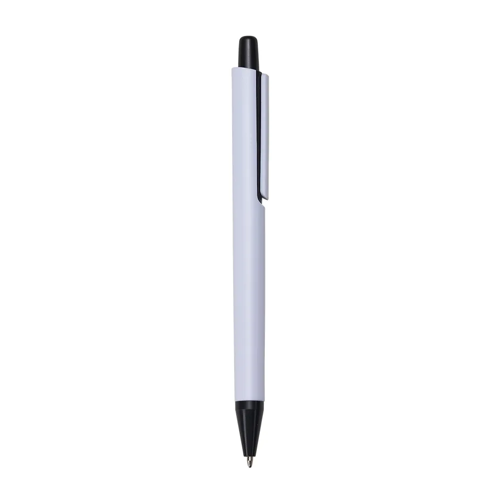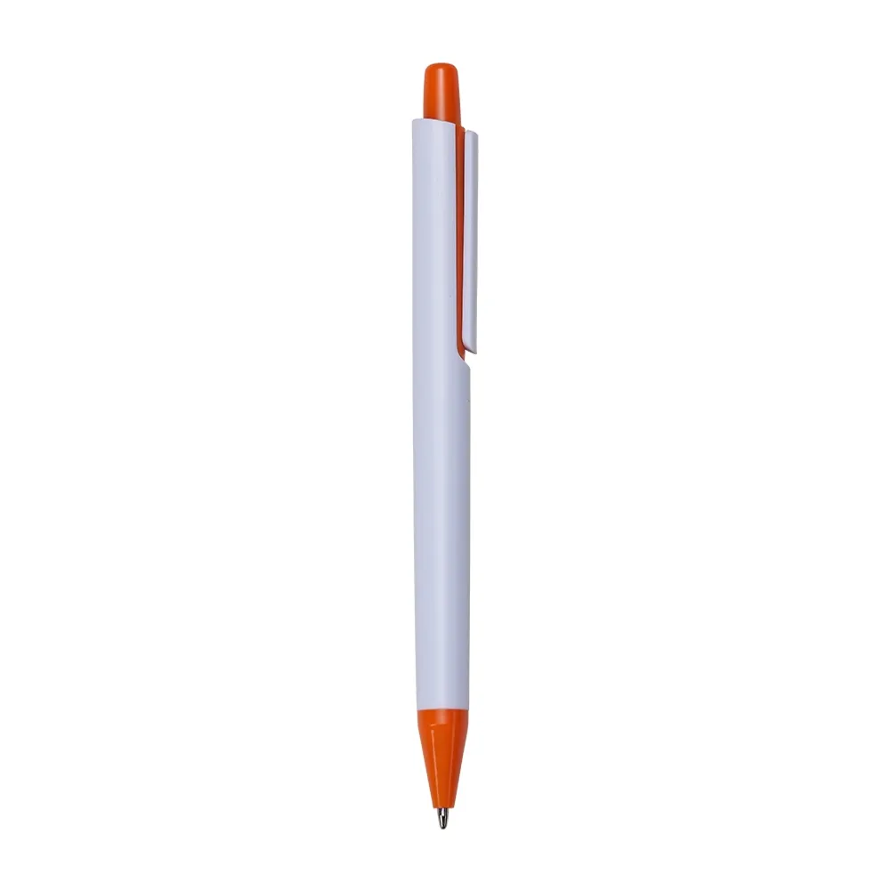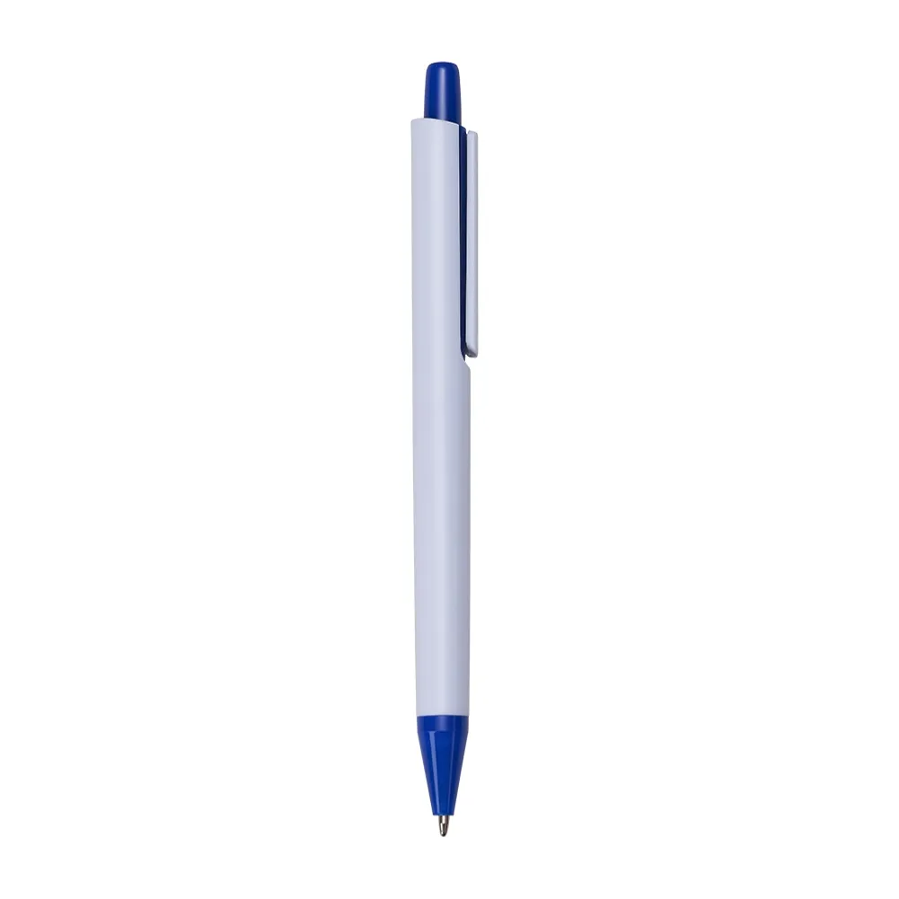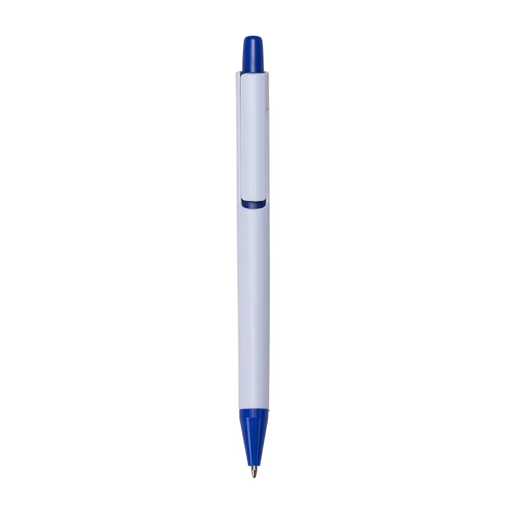 Caneta plástica com carga esferográfica azul e acionamento por clique.
