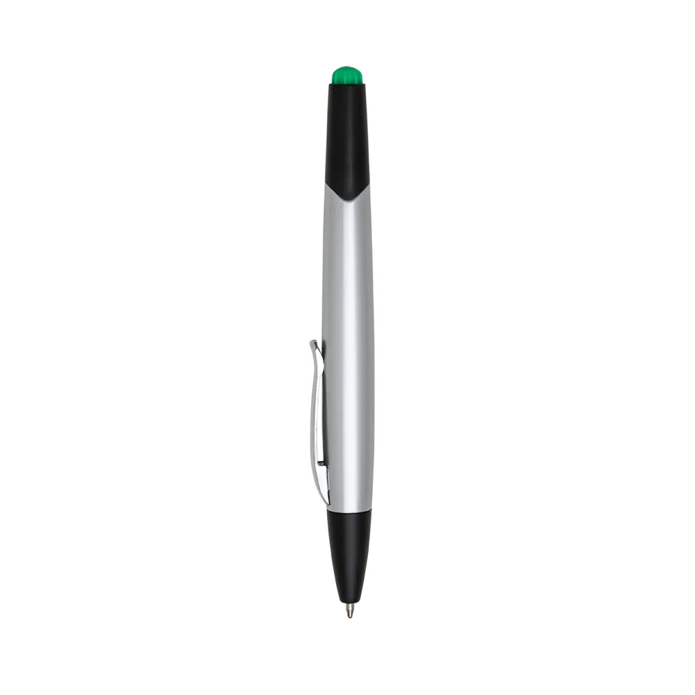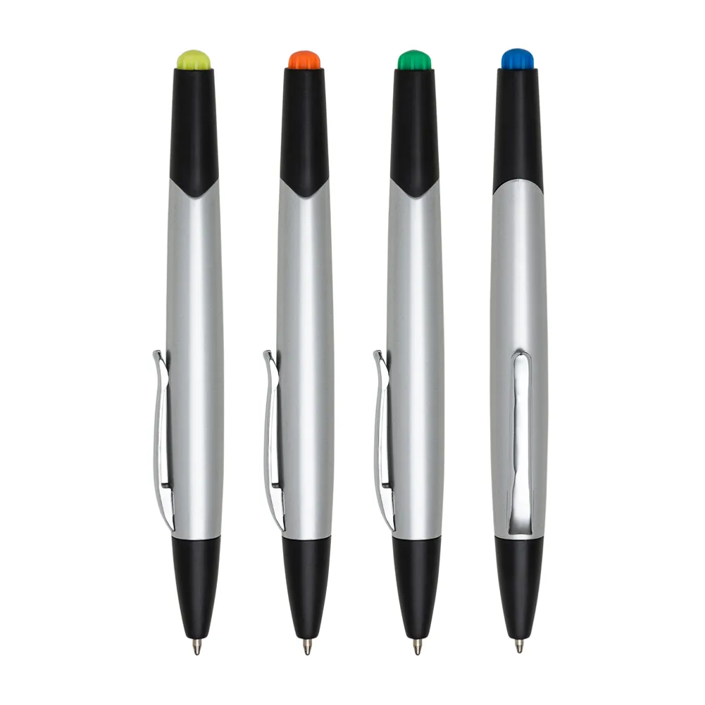 Caneta plástica com marca texto e carga esferográfica azul, ambas com tampas protetoras.