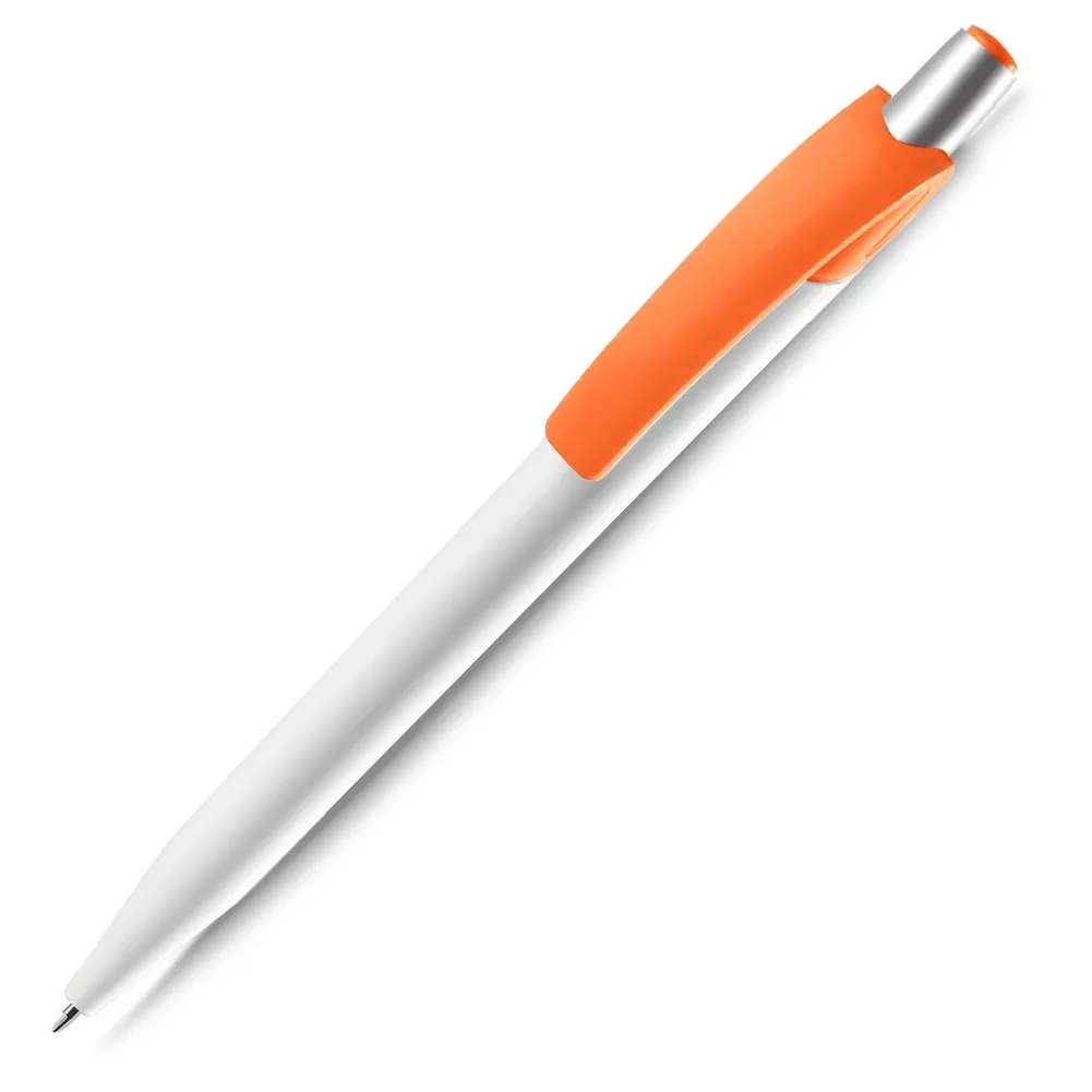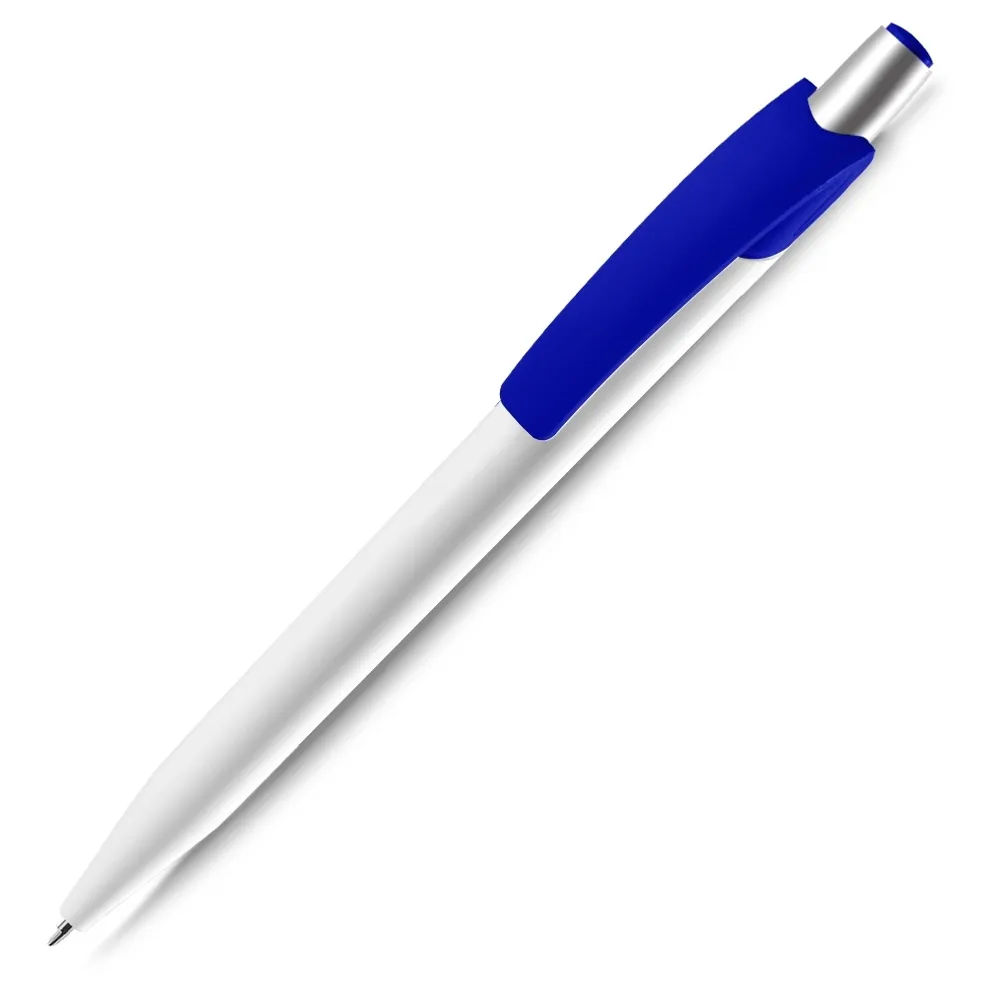Caneta plástica esferográfica retrátil escrita em azul. Refil tipo parker.
