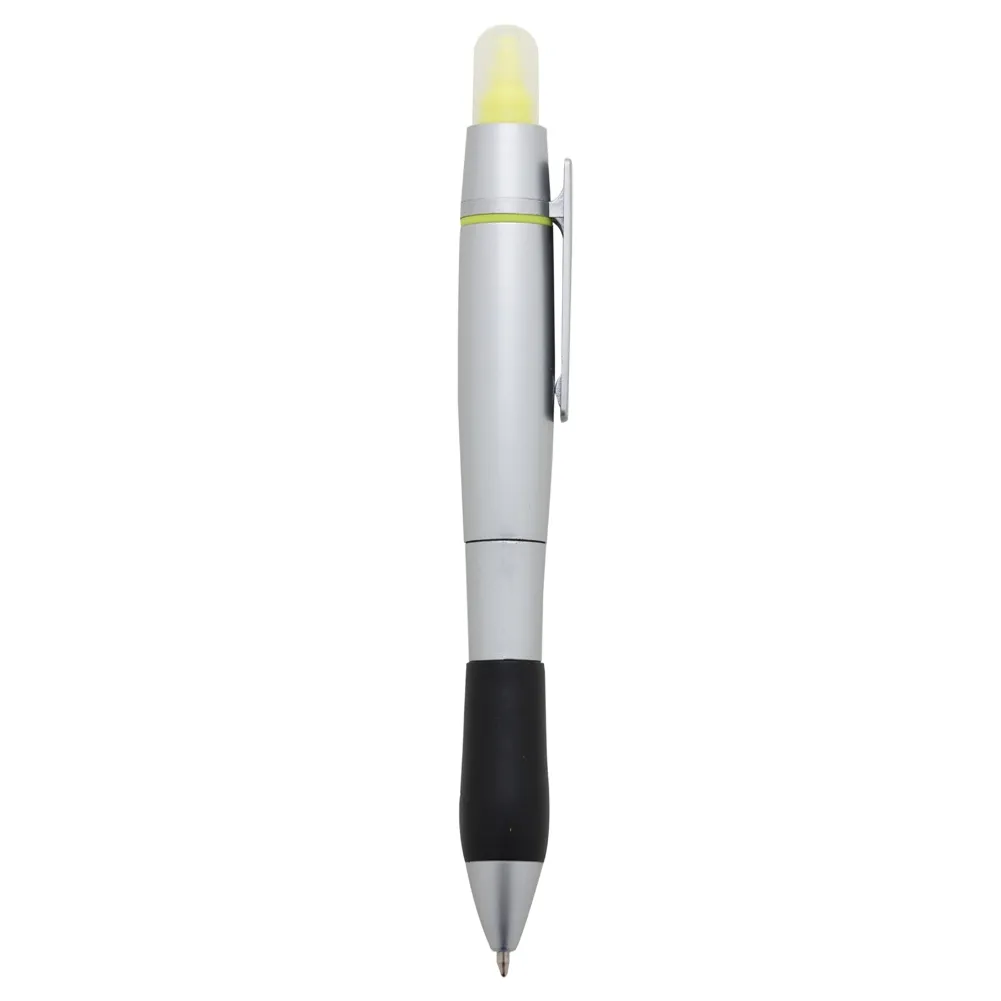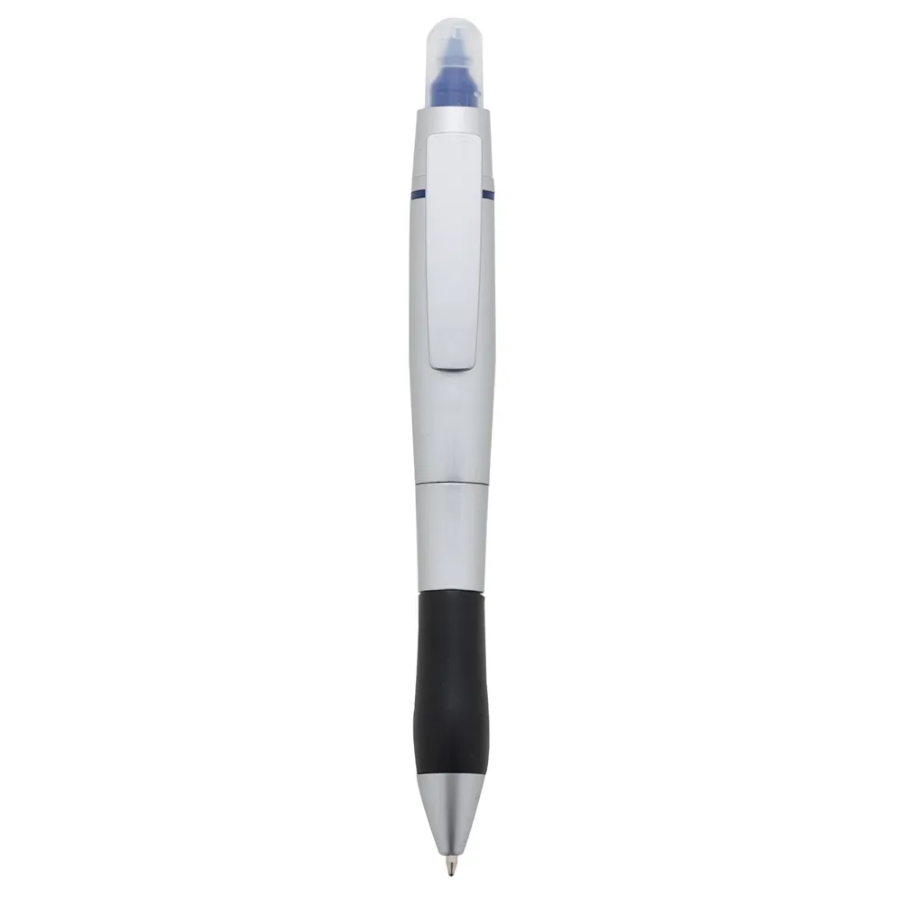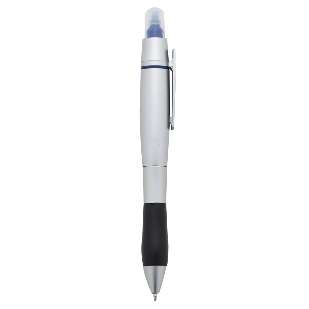 Caneta plástica com marca texto, contém detalhe emborrachado e tampa protetora para o marca texto. Carga esferográfica azul e acionamento por rotação.