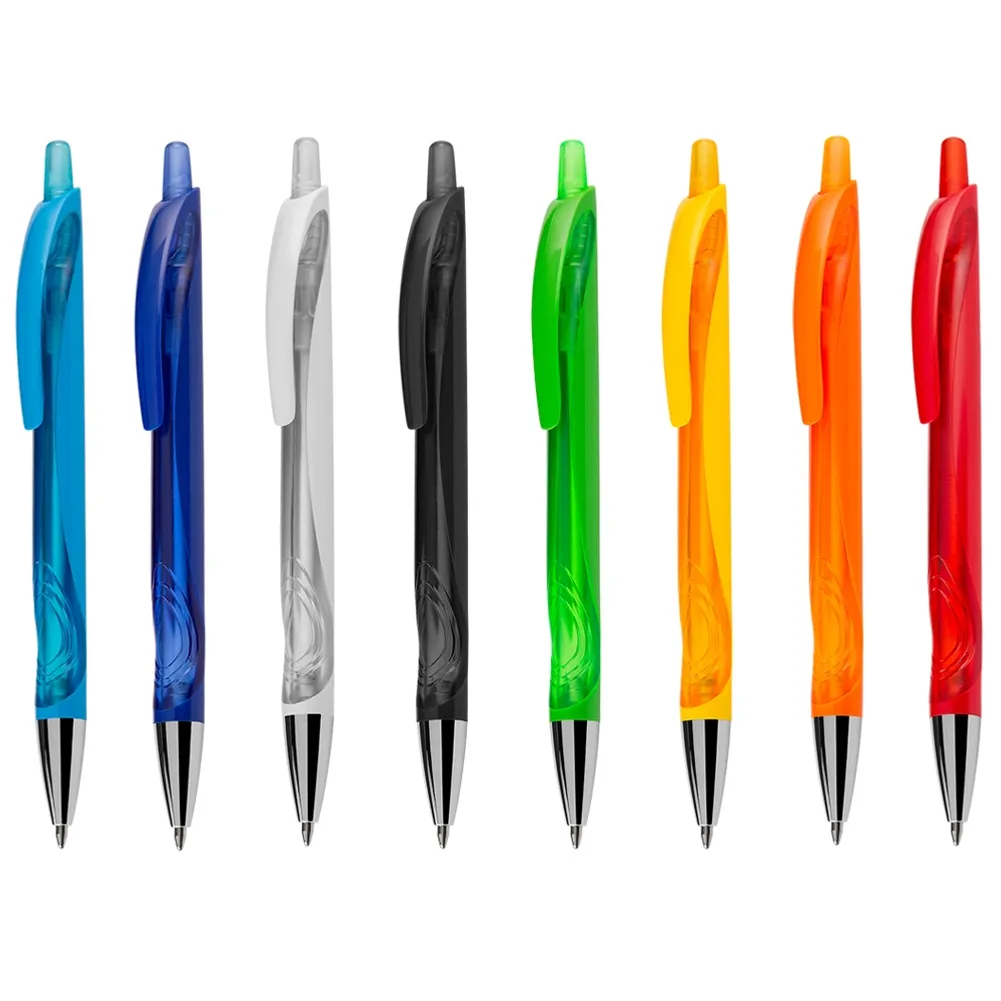 Caneta plástica inteira colorida com detalhe translúcido. Clip plástico, possui ponteira prata e aciona por clique.