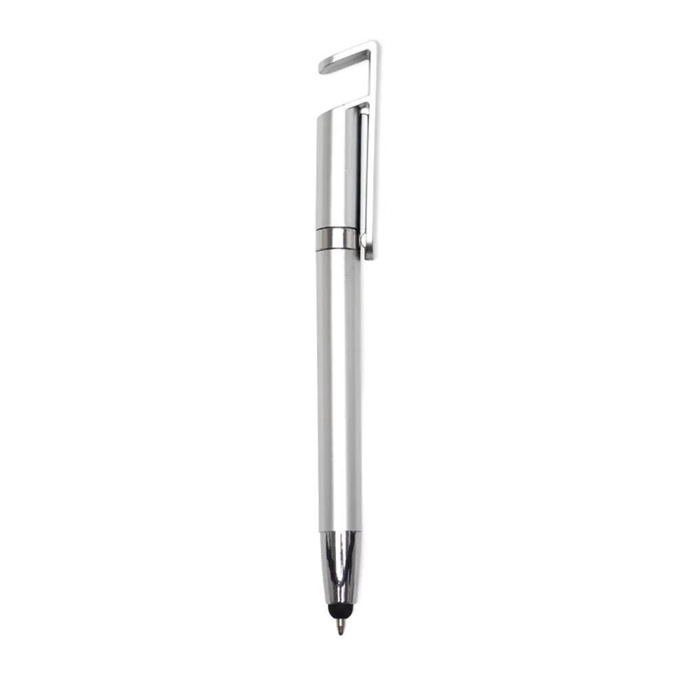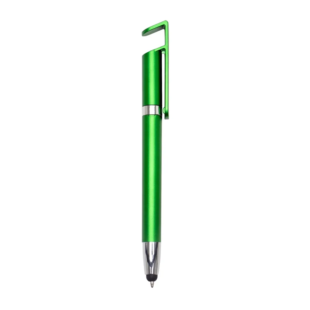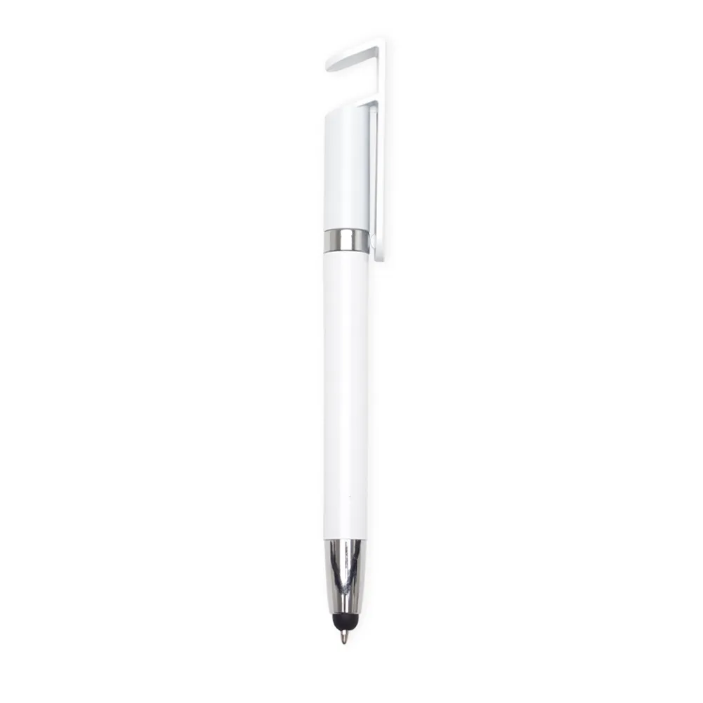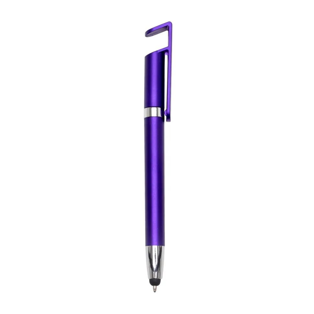Caneta plástica com suporte para celular e ponteira touch screen. Carga esferográfica azul 1.0mm e acionamento por rotação.