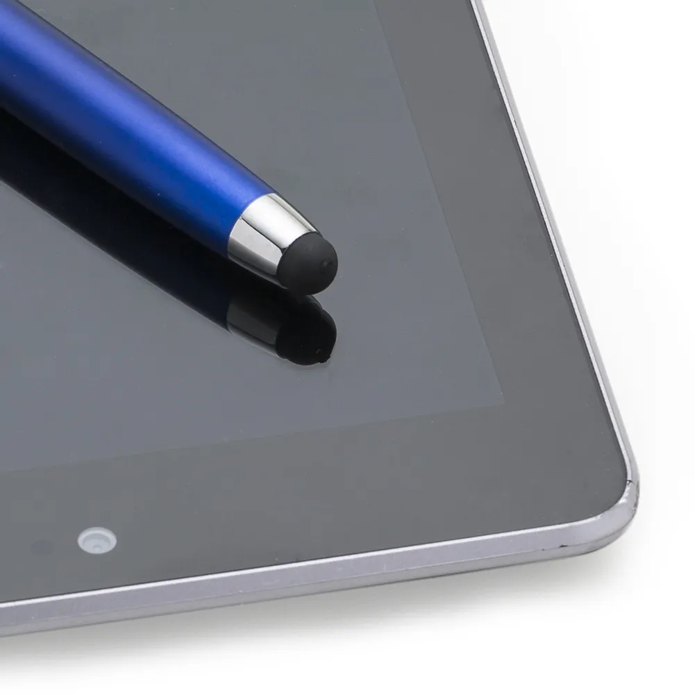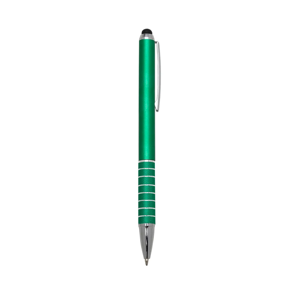 Caneta plástica com touch screen, carga esferográfica azul e acionamento por rotação.