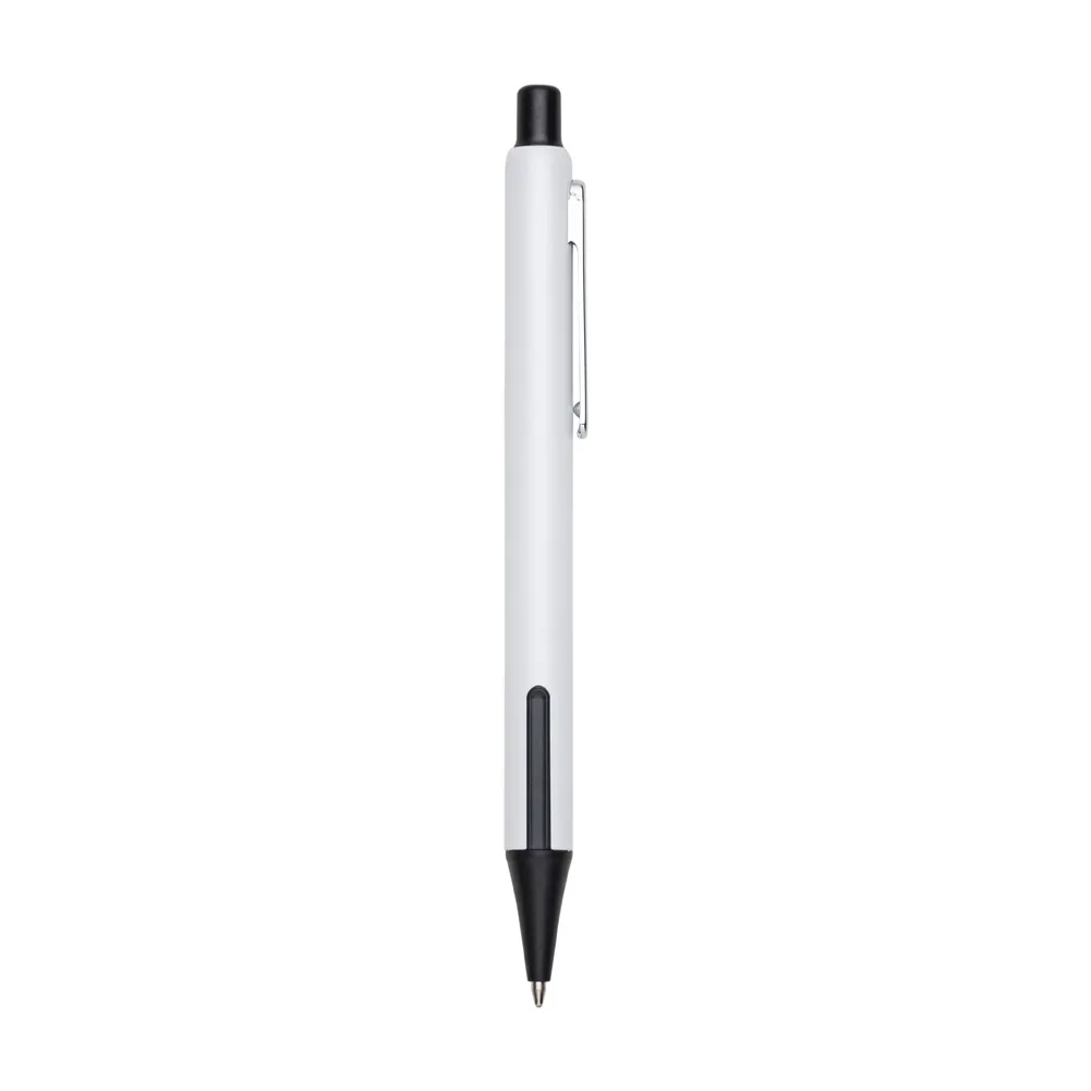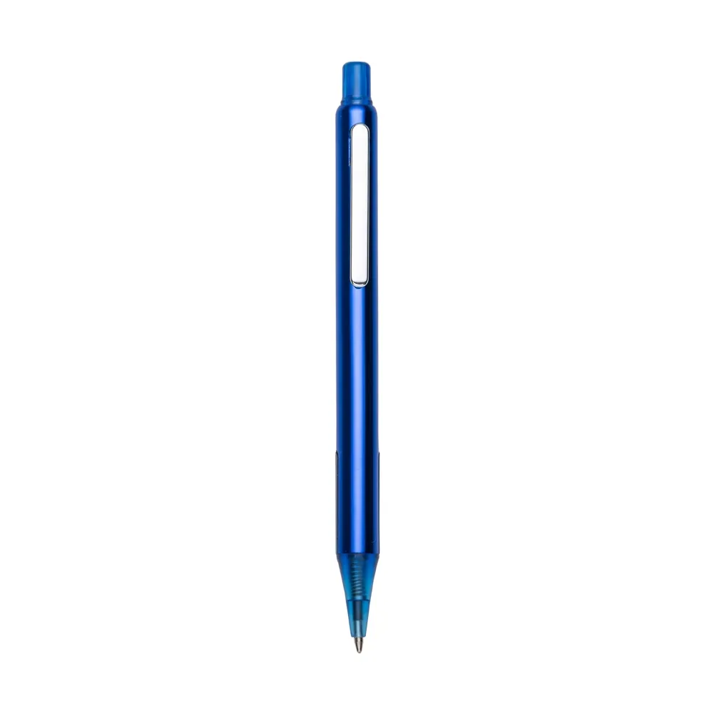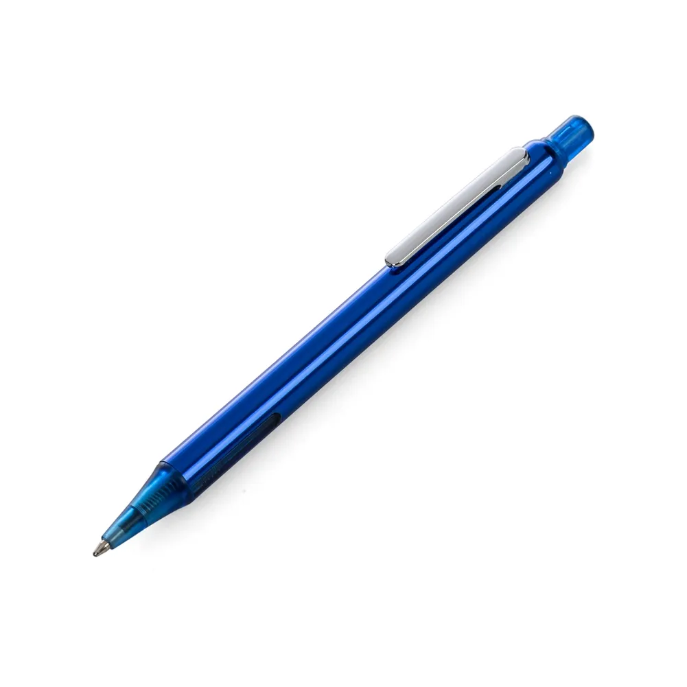 Caneta semimetálica com carga esferográfica azul e acionamento por clique. OBS.: PEDIDO APENAS MÚLTIPLO DE 50 PEÇAS!