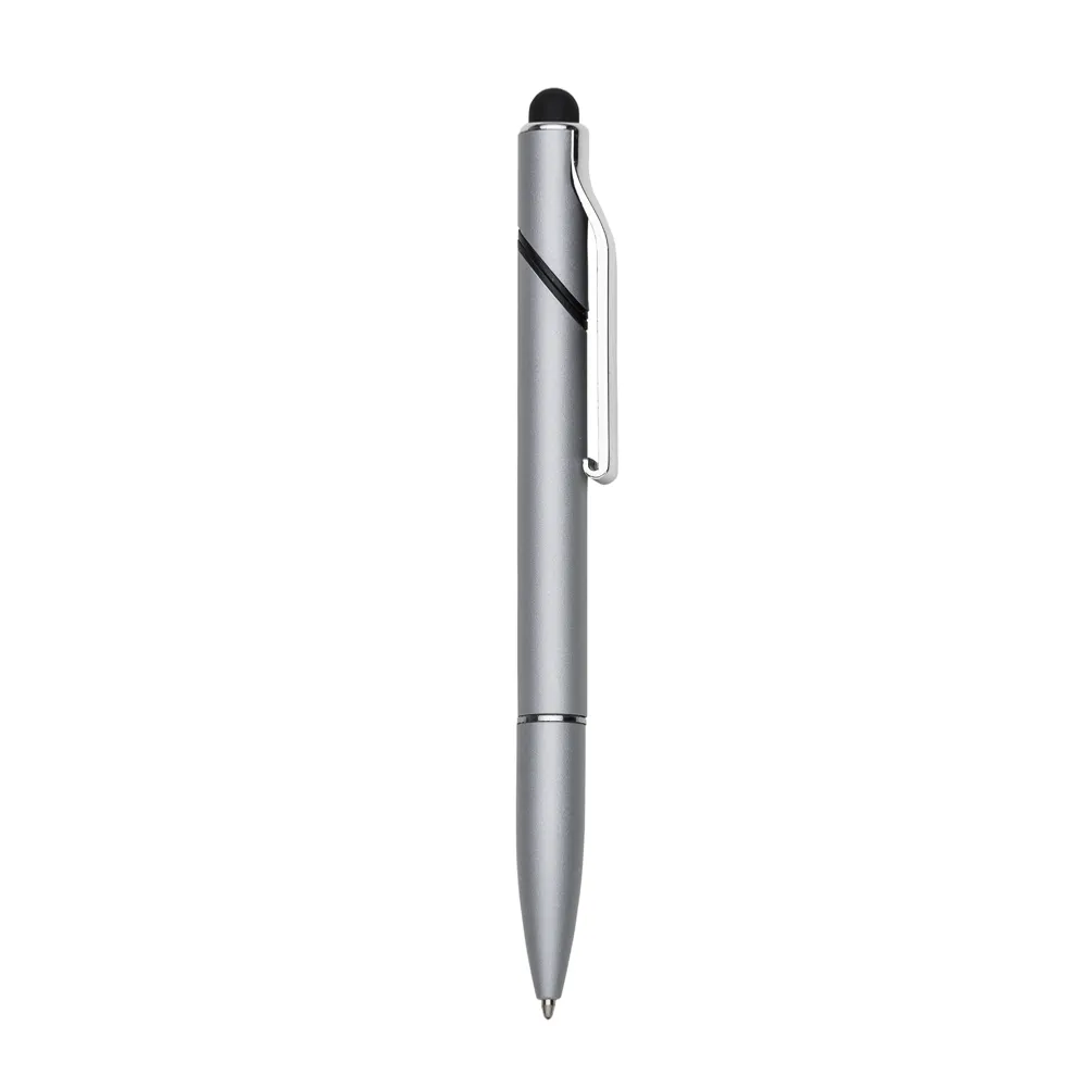 Caneta semimetálica base para celular e com ponteira touch screen. Acionamento por rotação. Carga esferográfica azul. OBS.: PEDIDOS APENAS MÚLTIPLOS DE 50 PEÇAS!