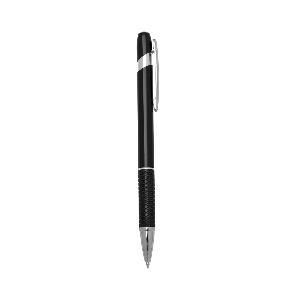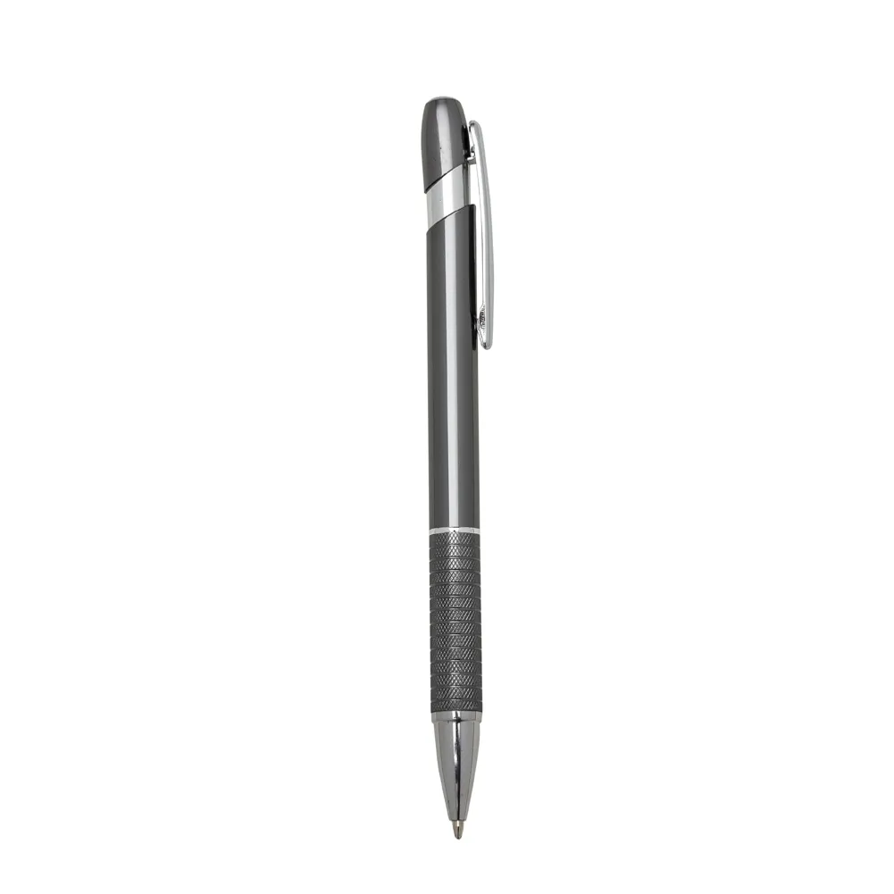 Caneta semimetálica, carga esferográfica azul e acionamento por clique.