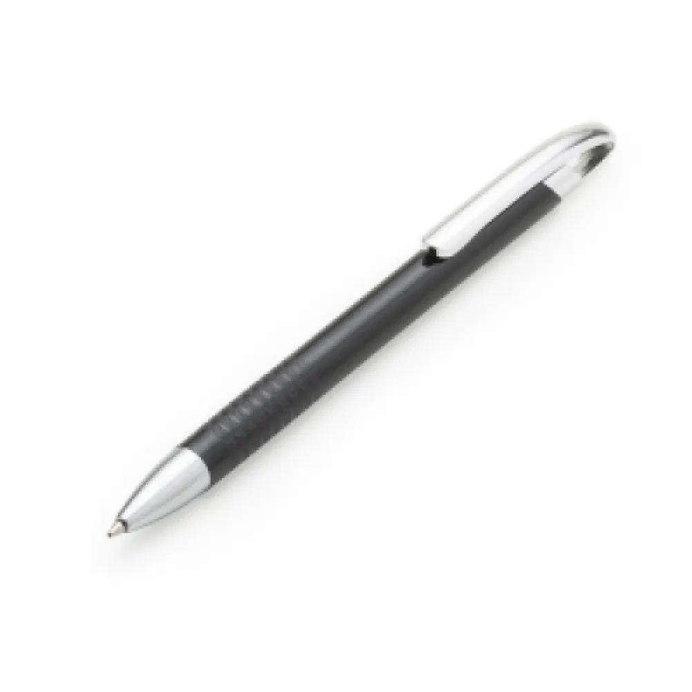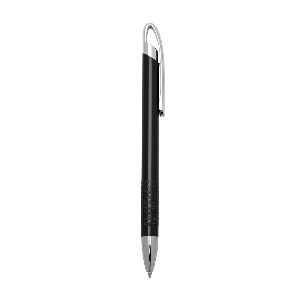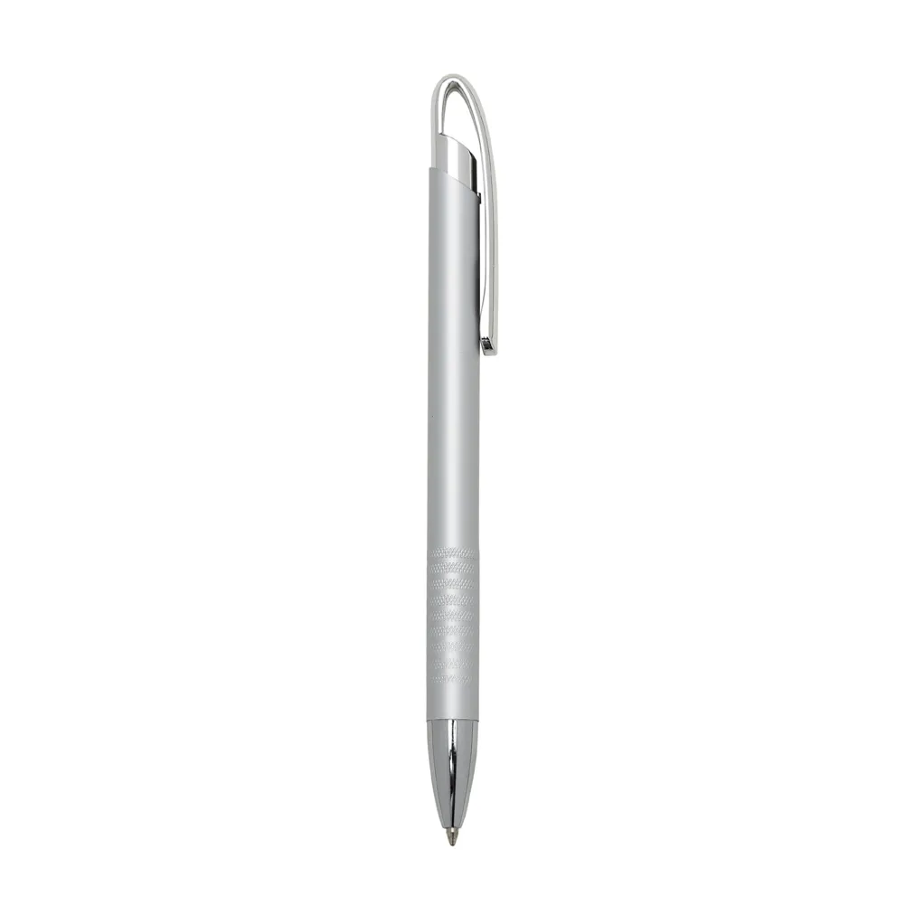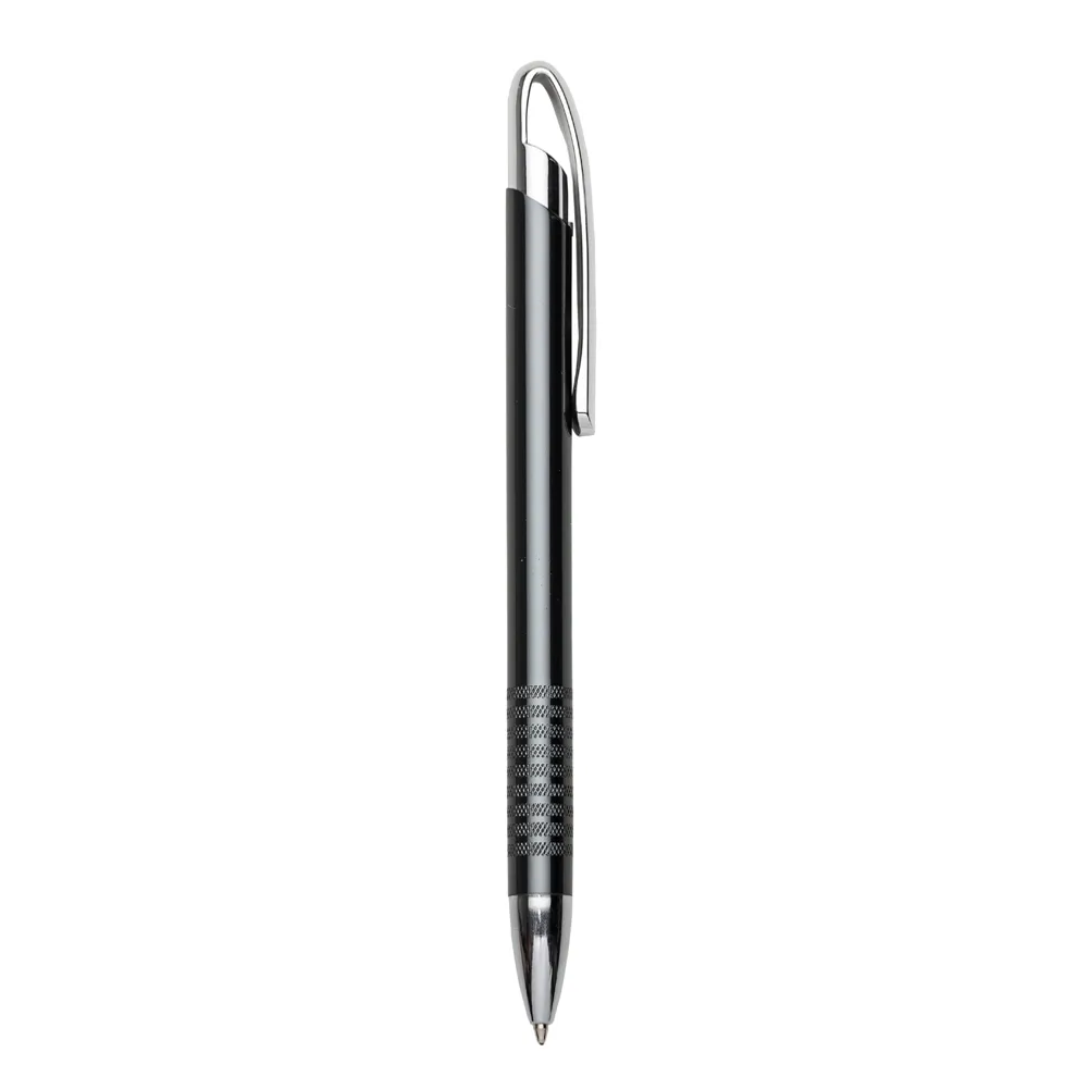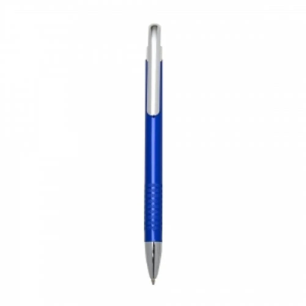 Caneta semimetálica, carga esferográfica azul e acionamento por clique.