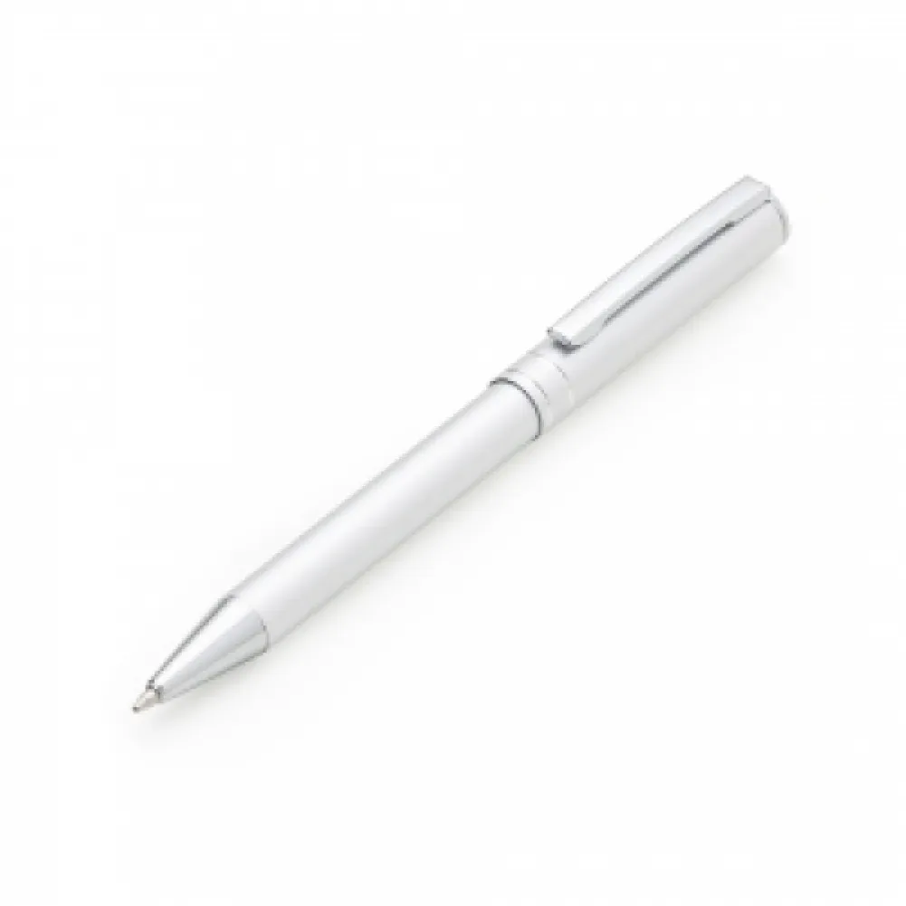 Caneta semimetálica, carga esferográfica azul e acionamento por clique.