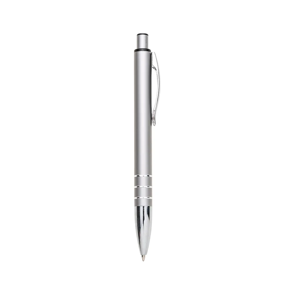 Caneta semimetálica, carga esferográfica azul e acionamento por clique.
