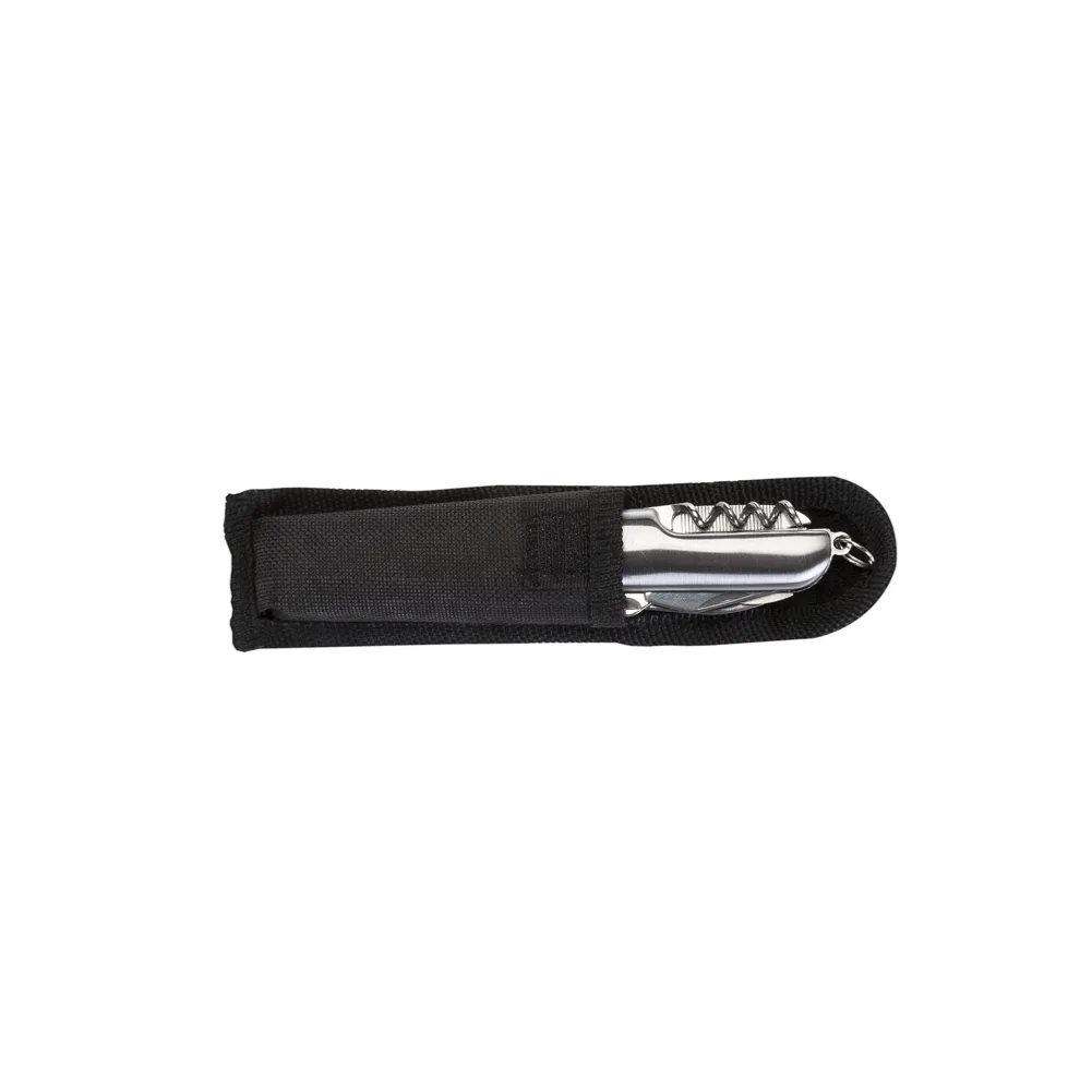 Canivete metal 9 funções com detalhes emborrachados preto(três linhas frente e verso). Possui: lâmina de corte, serrilha, mini tesoura, abridor de latas, abridor de garrafa, chave phillips, lixa, agulha de sutura e saca-rolhas. Acompanha bainha em nylon.