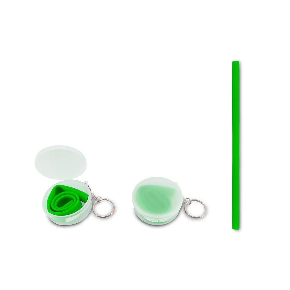 Canudo flexível de silicone em estojo plástico fosco com chaveiro.
