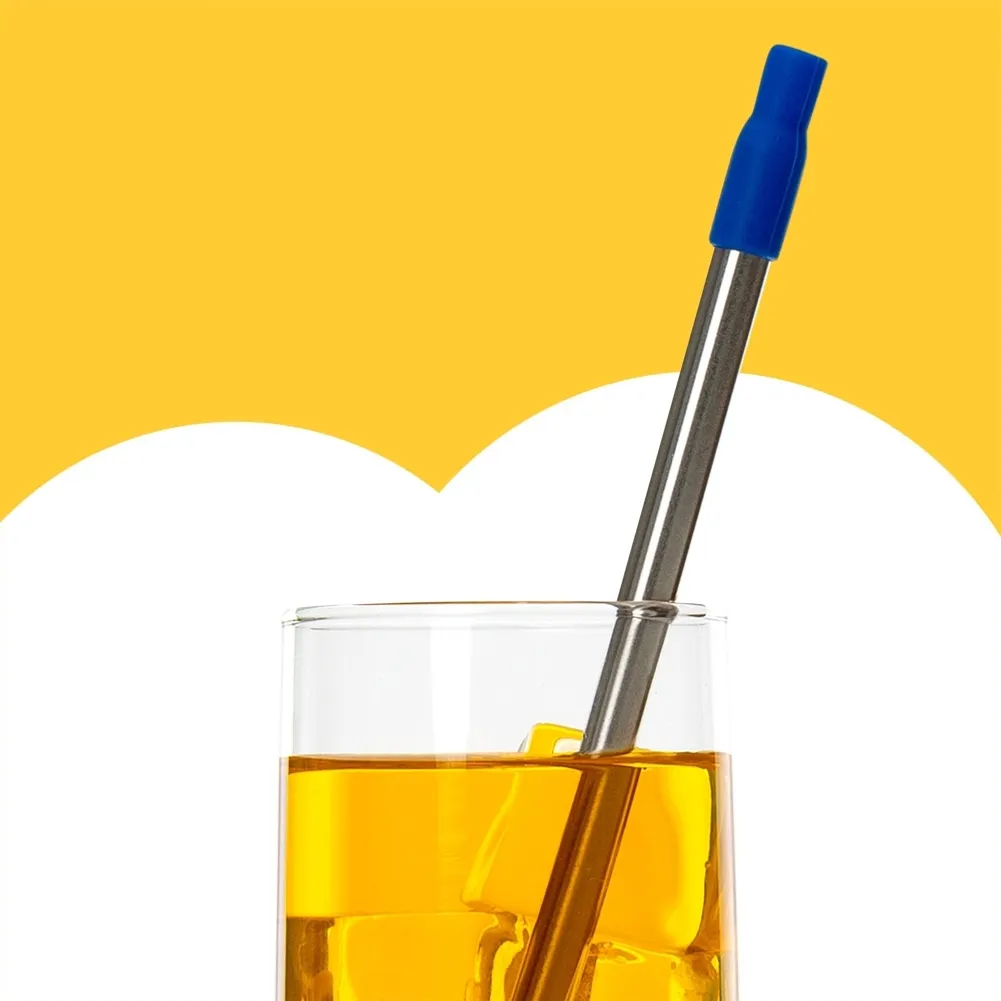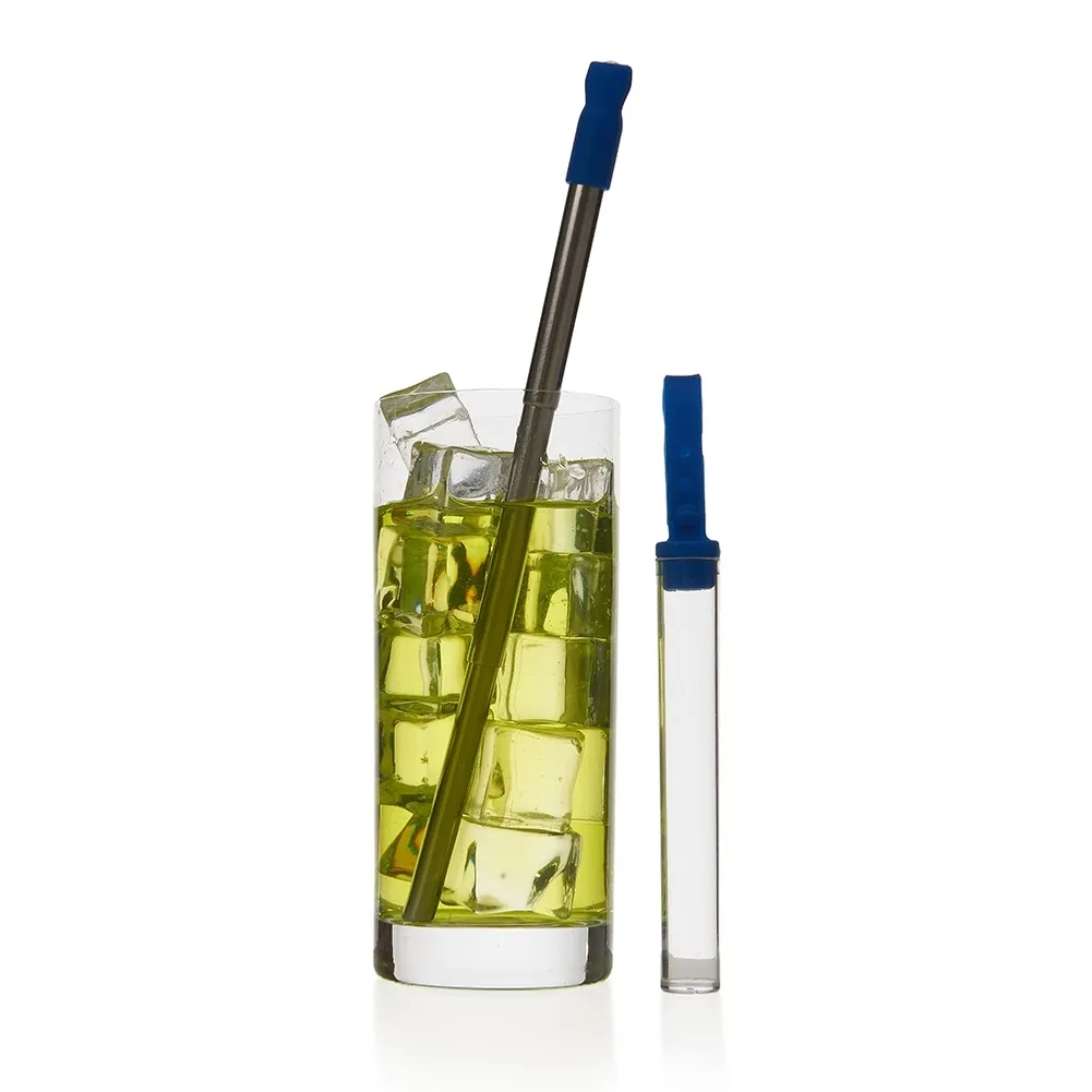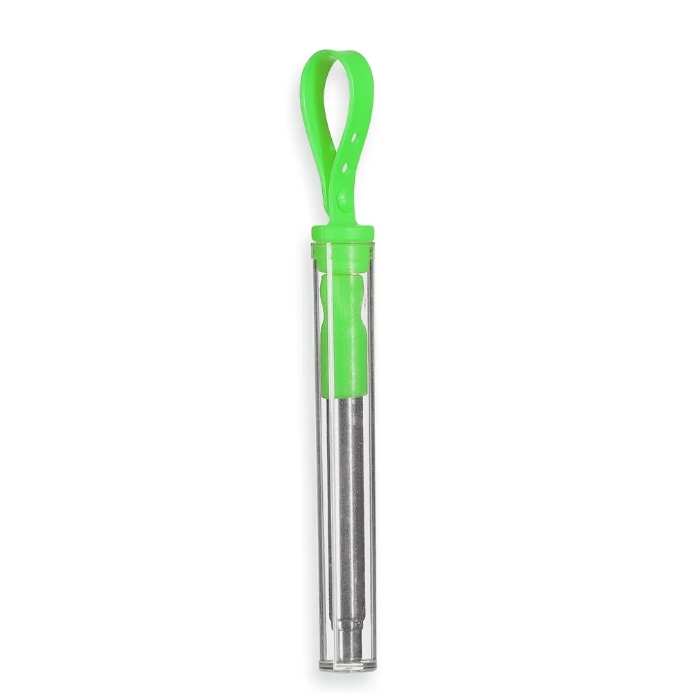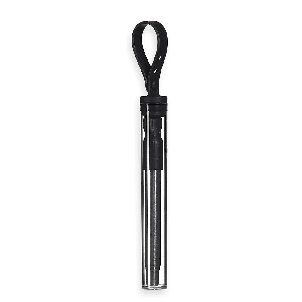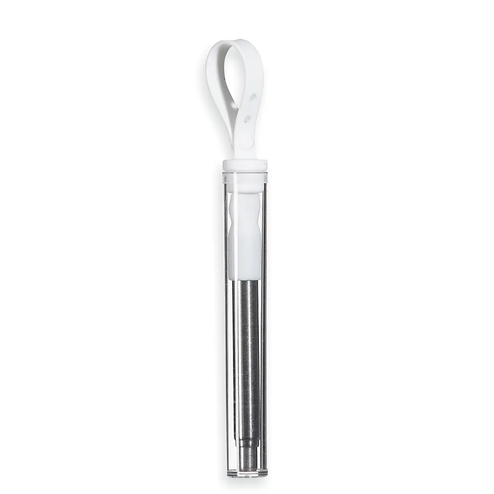 O canudo vem em um tubo plástico transparente com tampa e alça de silicone para transporte.