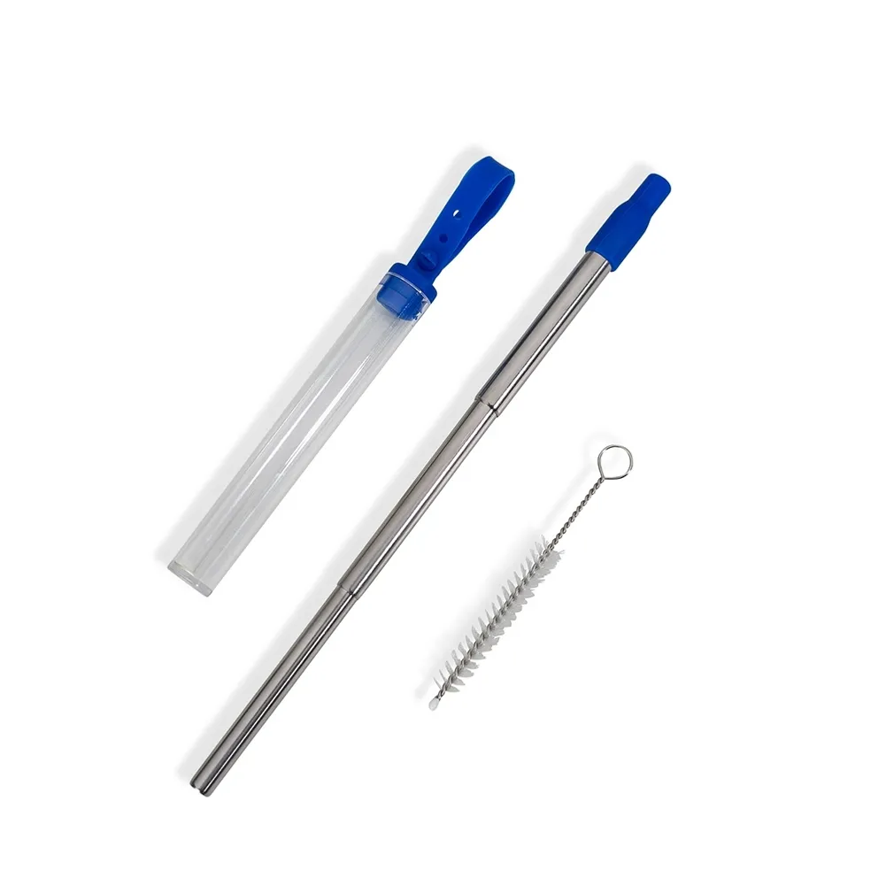 Canudo retrátil em inox com bocal de silicone e escova de limpeza.