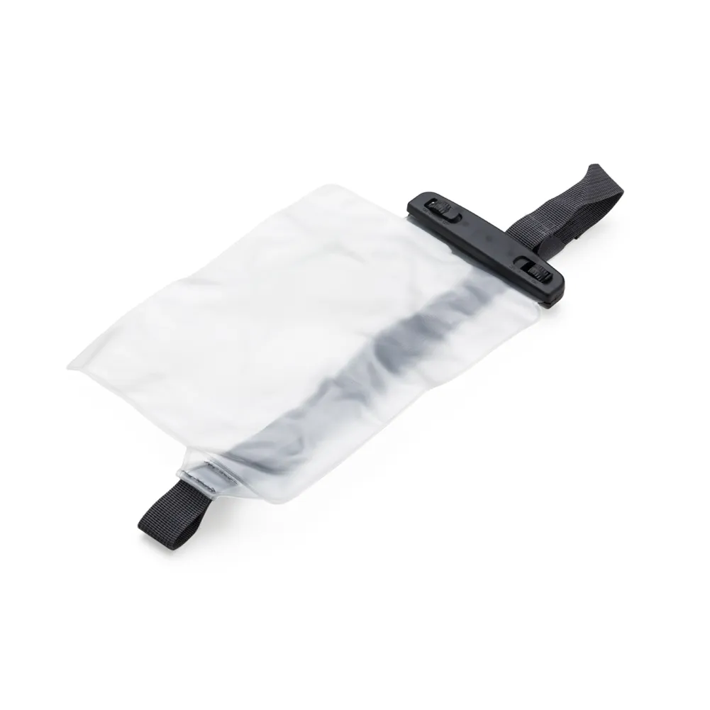 Capa impermeável para itens diversos. Parte frontal transparente e verso fosco, suporte plástico preto com fivelas rotatórias(basta rotacioná-las para abrir o case). Possui alça de nylon ajustável com fivela plástica.