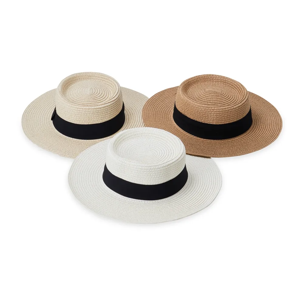 Chapéu de palha com aba levemente ondulada e faixa de poliéster fixa, feito em tamanho único com ajuste interno.