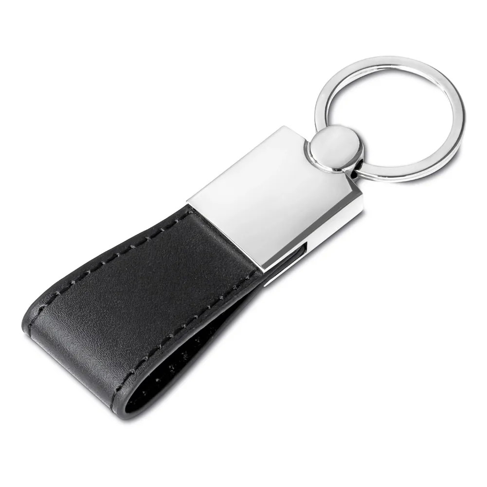 Chaveiro de metal com alça em couro sintético preto em formato trapézio + caixa com berço aveludado