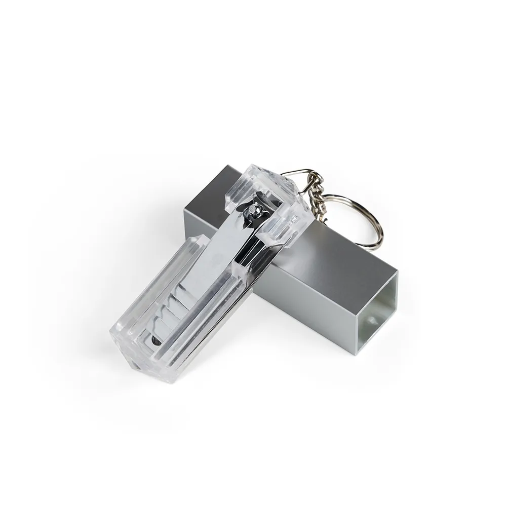 Chaveiro kit manicure 4 peças em estojo plástico. Possui lixa, pinça, empurrador de cutícula e cortador de unha preso. Estojo com berço plástico para acomodação das peças.