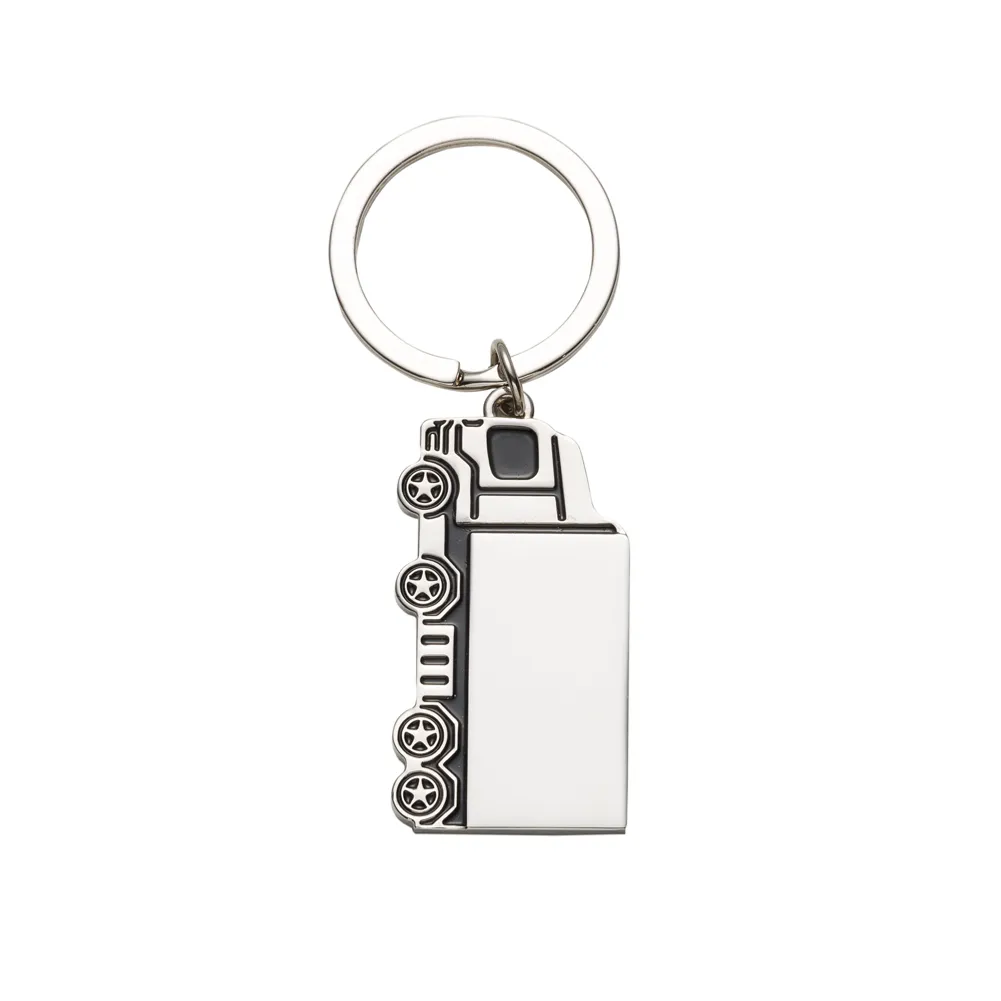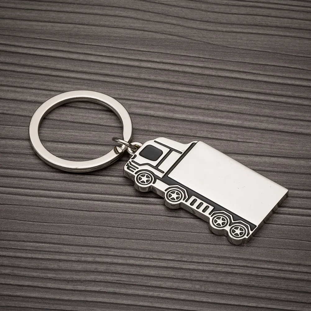 Chaveiro metal com chapa em formato caminhão brilhante, possui detalhes preto em relevo na frente e verso liso.