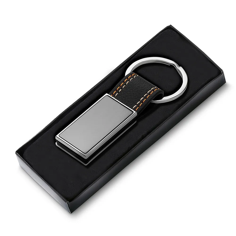 Chaveiro de metal em níquel brilhante com alça em PU, chapinha frente e verso em grafite lisa.