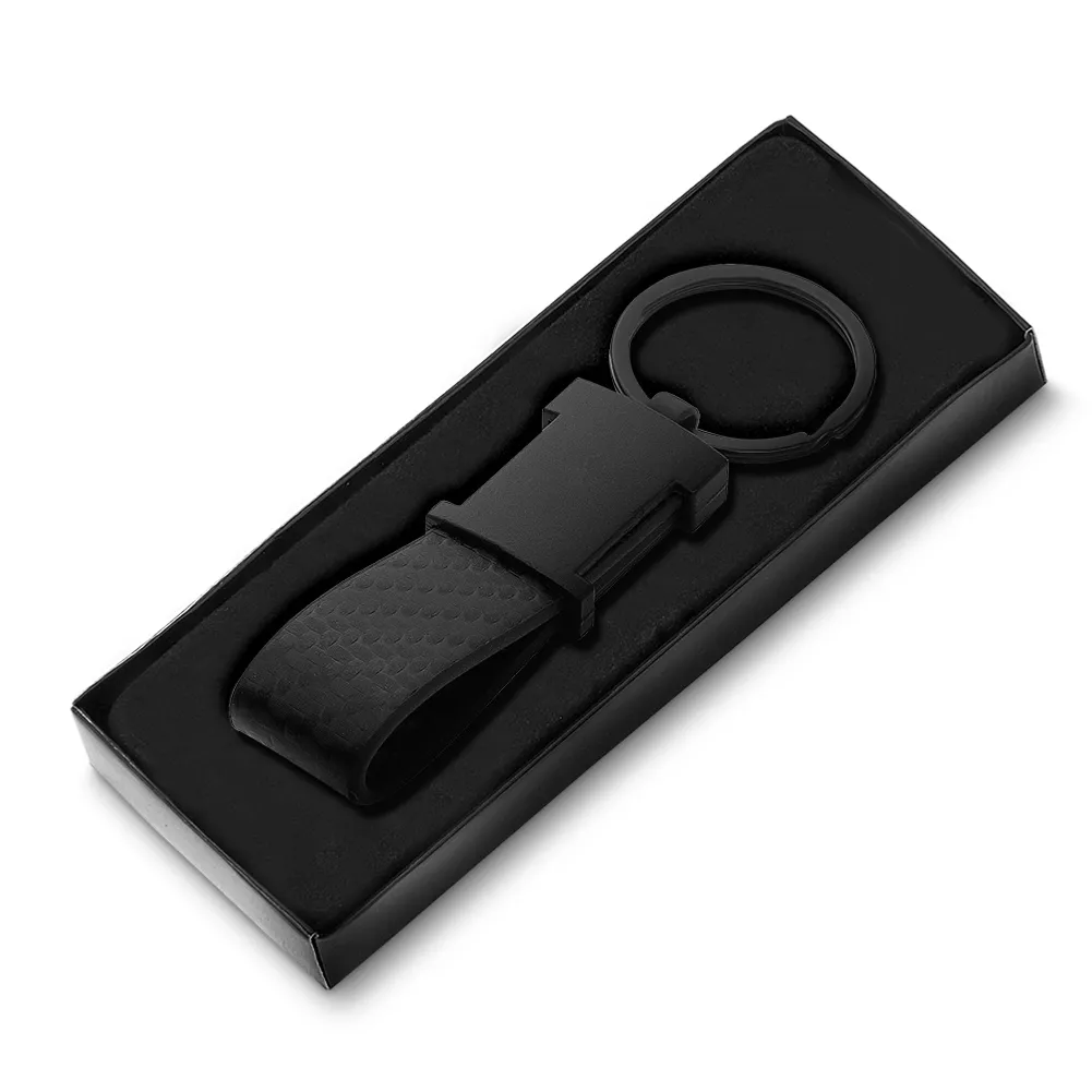 Chaveiro de metal em níquel brilhante com alça em PU, frente lisa e verso com dois parafusos.