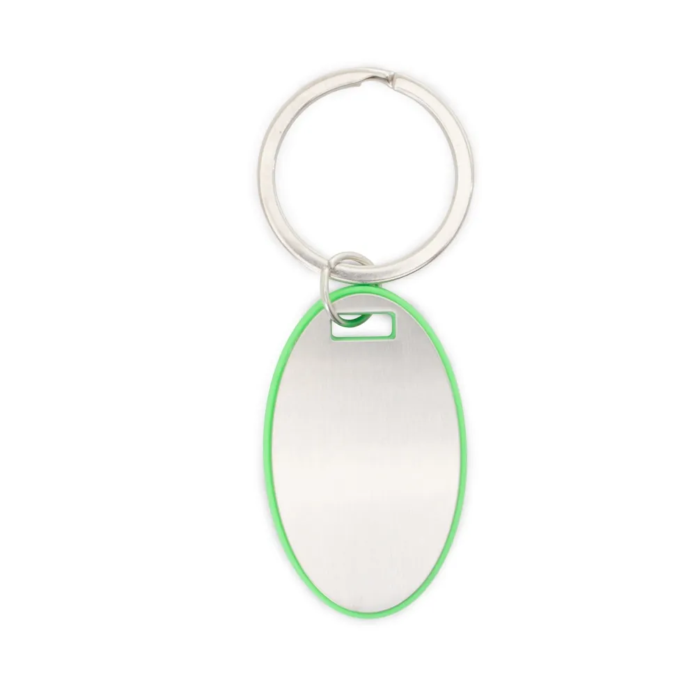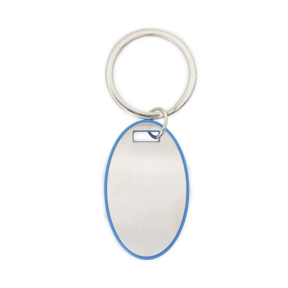 Chaveiro com detalhe plástico e chapa metálica, personalizável frente e verso.