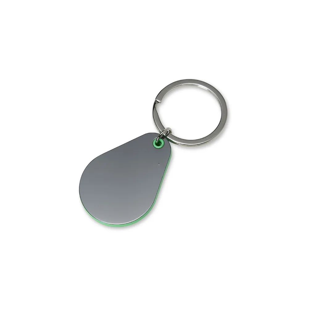 Chaveiro com detalhe plástico e chapa metálica grafite, personalizável frente e verso.